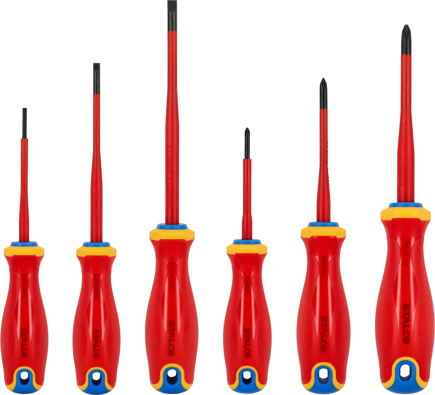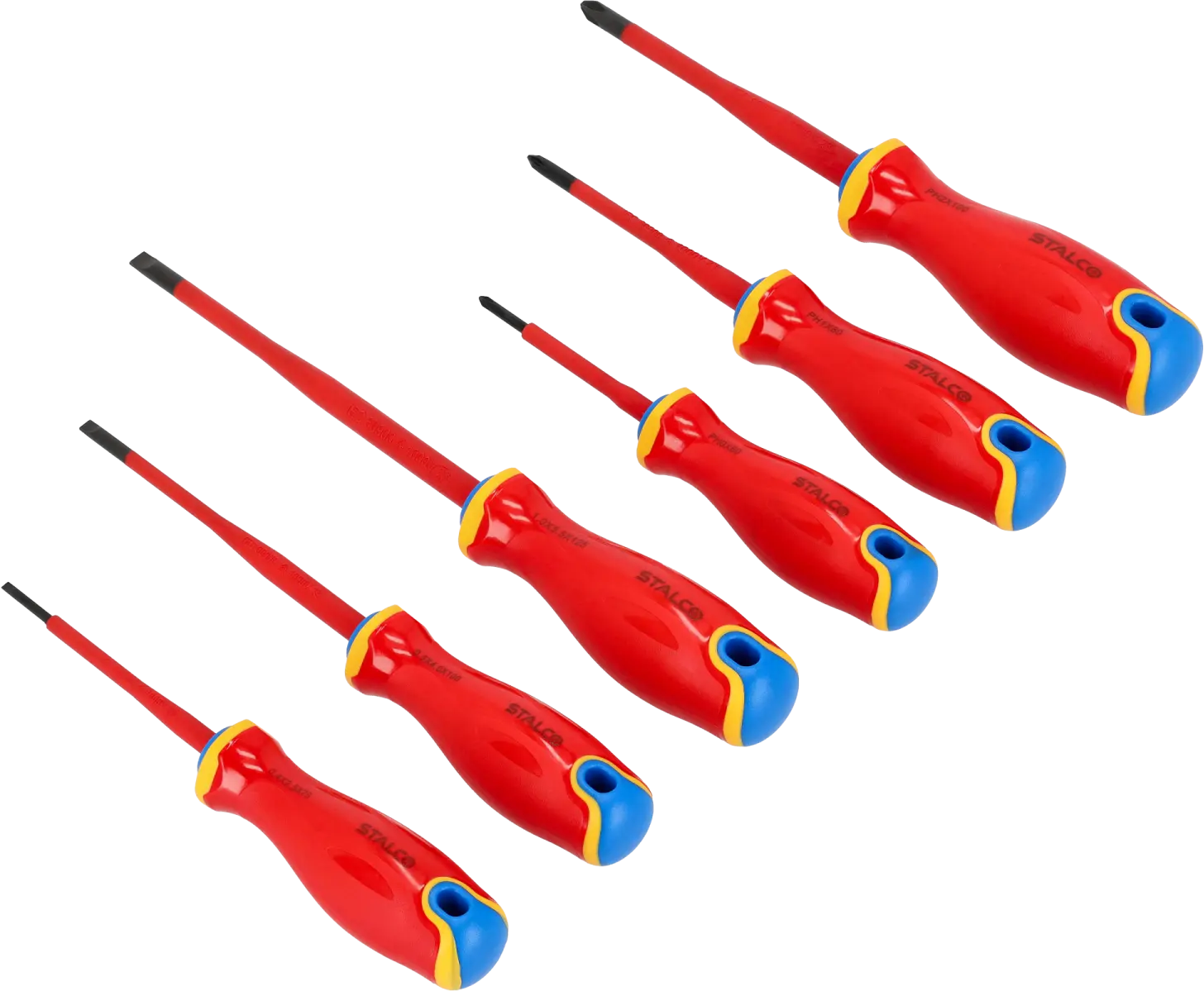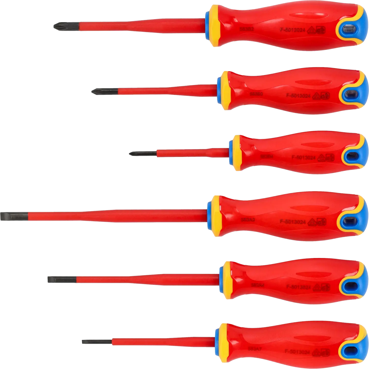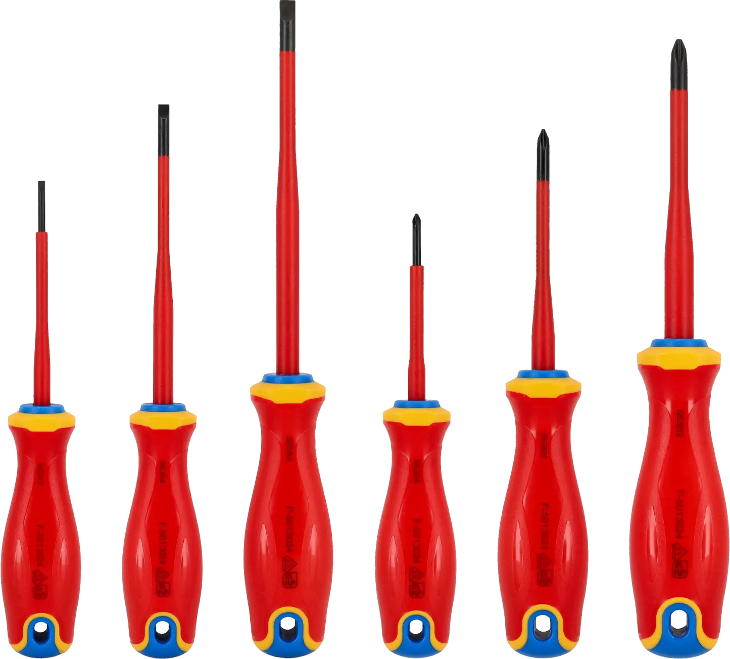 A set of 6 screwdrivers, certified for use with a voltage of 1000V, equipped with an ergonomic, three-material, non-slip handle and screwdriver bits made of S2 steel.