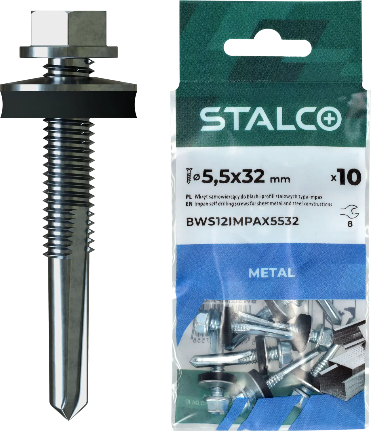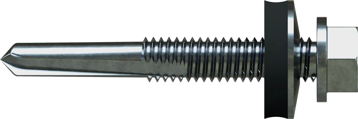 The IMPAX-type self-drilling screw for steel sheets and profiles is designed for fastening sheet metal to hot-rolled steel structures. It is made of galvanized steel and equipped with an additional steel washer with EPDM. It can be used to fasten sheets to steel profiles up to 8 mm thick. The self-drilling tip of the shank facilitates precise positioning of the element. The EPDM washer ensures tightness at the drilling point.