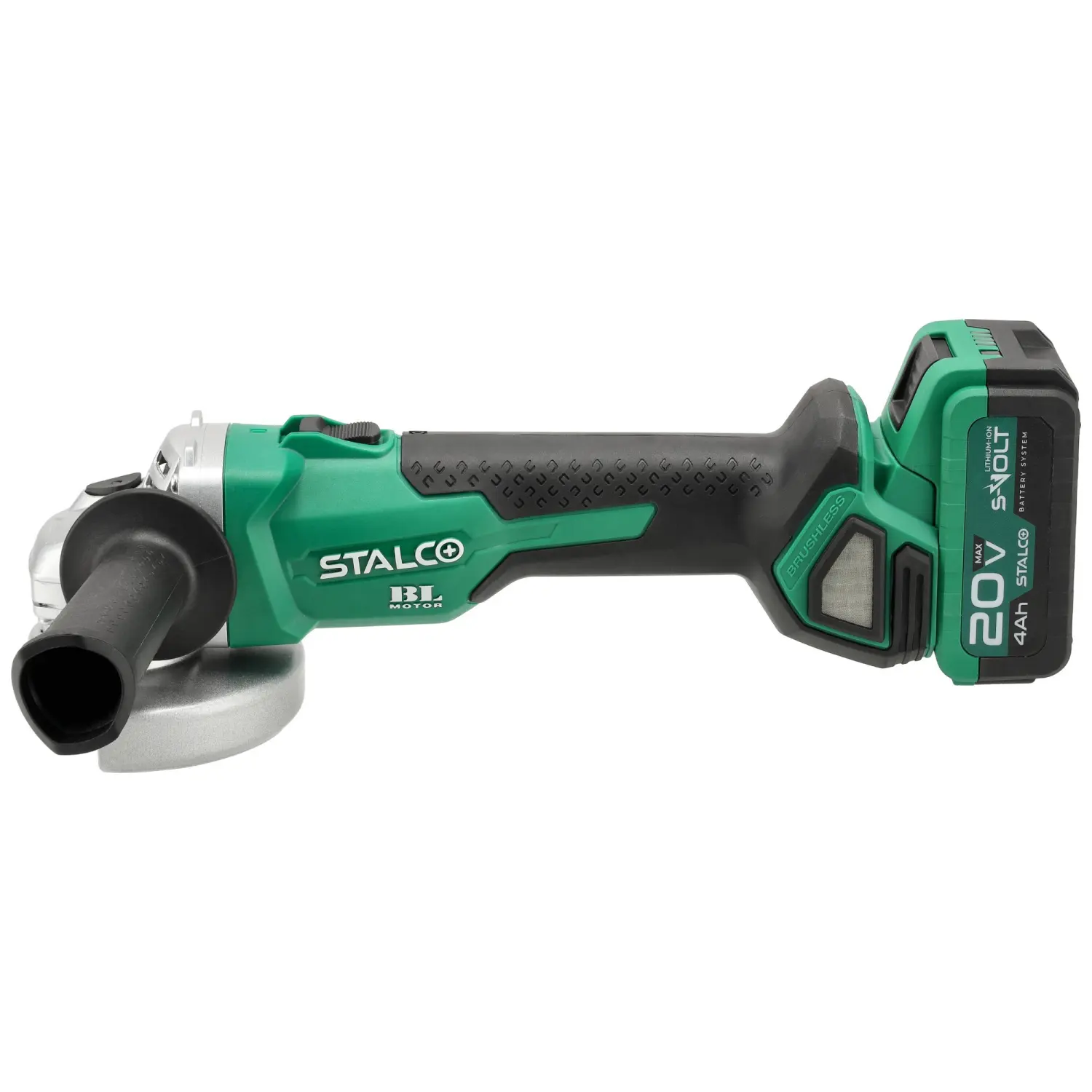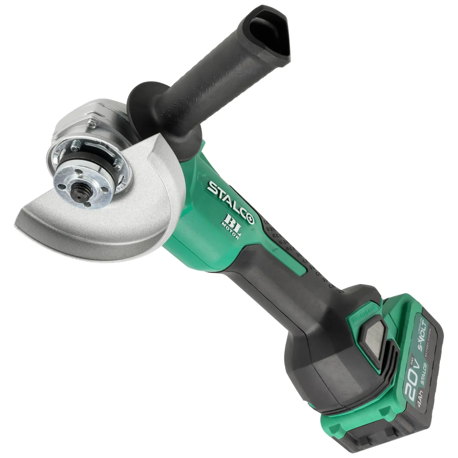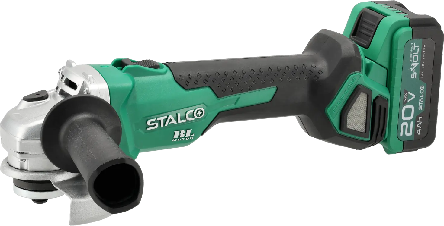 The AGS20-125BL Cordless Angle Grinder is one of the most versatile workshop and construction tools. It features a rotating mechanism with an M14 spindle that allows mounting discs for various applications. Depending on the chosen accessory, the STALCO Cordless Angle Grinder can be used for grinding and cutting hard construction materials. It is compatible with all 125 mm discs. The device’s ventilation design efficiently removes excess heat while preventing dust and debris from entering. Safety and comfort are enhanced by the soft start system, electric brake, and kickback protection.