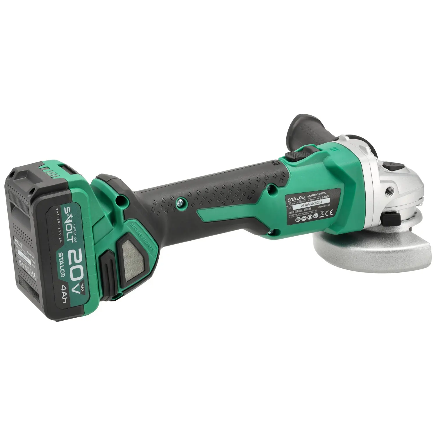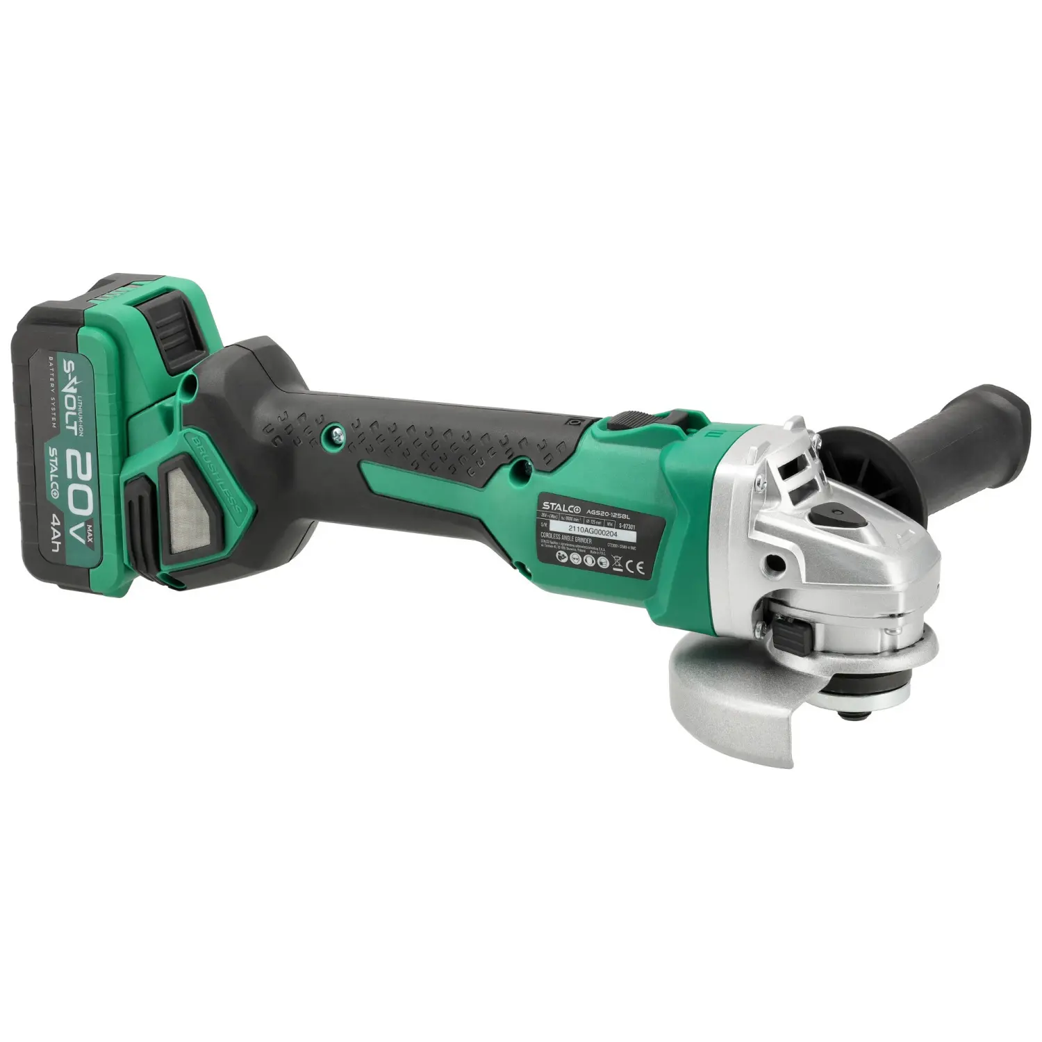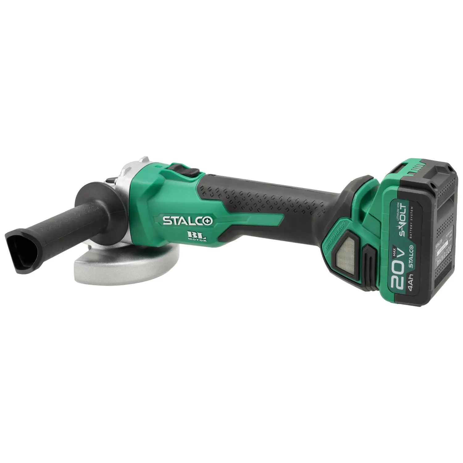 The AGS20-125BL Cordless Angle Grinder is one of the most versatile workshop and construction tools. It features a rotating mechanism with an M14 spindle that allows mounting discs for various applications. Depending on the chosen accessory, the STALCO Cordless Angle Grinder can be used for grinding and cutting hard construction materials. It is compatible with all 125 mm discs. The device’s ventilation design efficiently removes excess heat while preventing dust and debris from entering. Safety and comfort are enhanced by the soft start system, electric brake, and kickback protection.