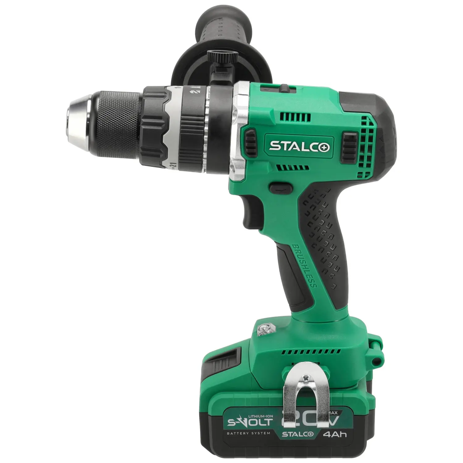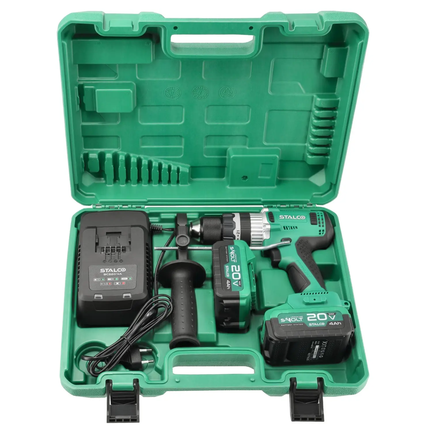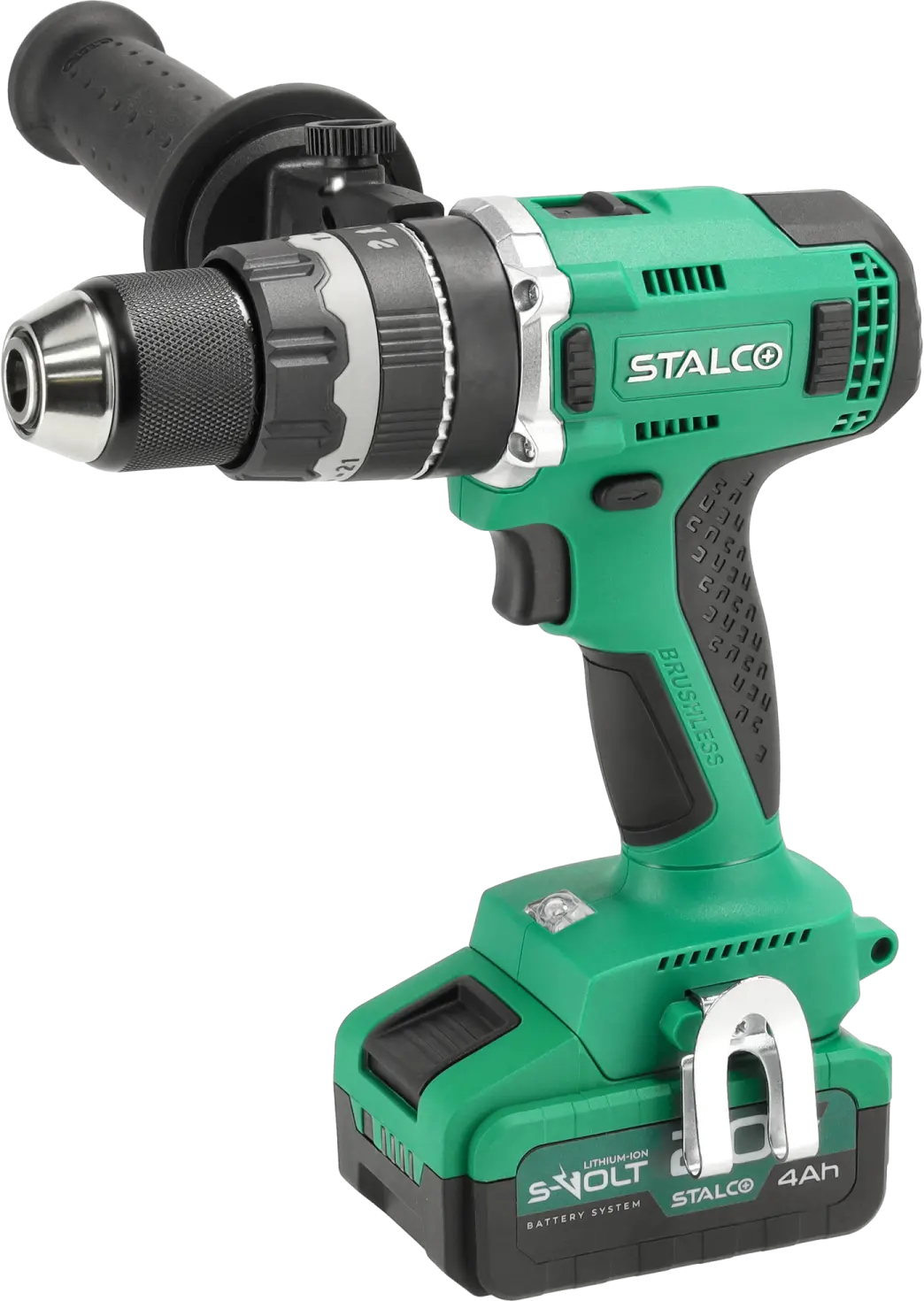 • The Cordless Hammer Drill Driver comes with two 4 Ah batteries. Their power, handle design, and specifications allow them to be used with other STALCO power tools compatible with the S-Volt system. The set also includes a cooling charger for rapid charging. Additional accessories include a functional belt hook, extra handle, depth stop, and a convenient carrying case.