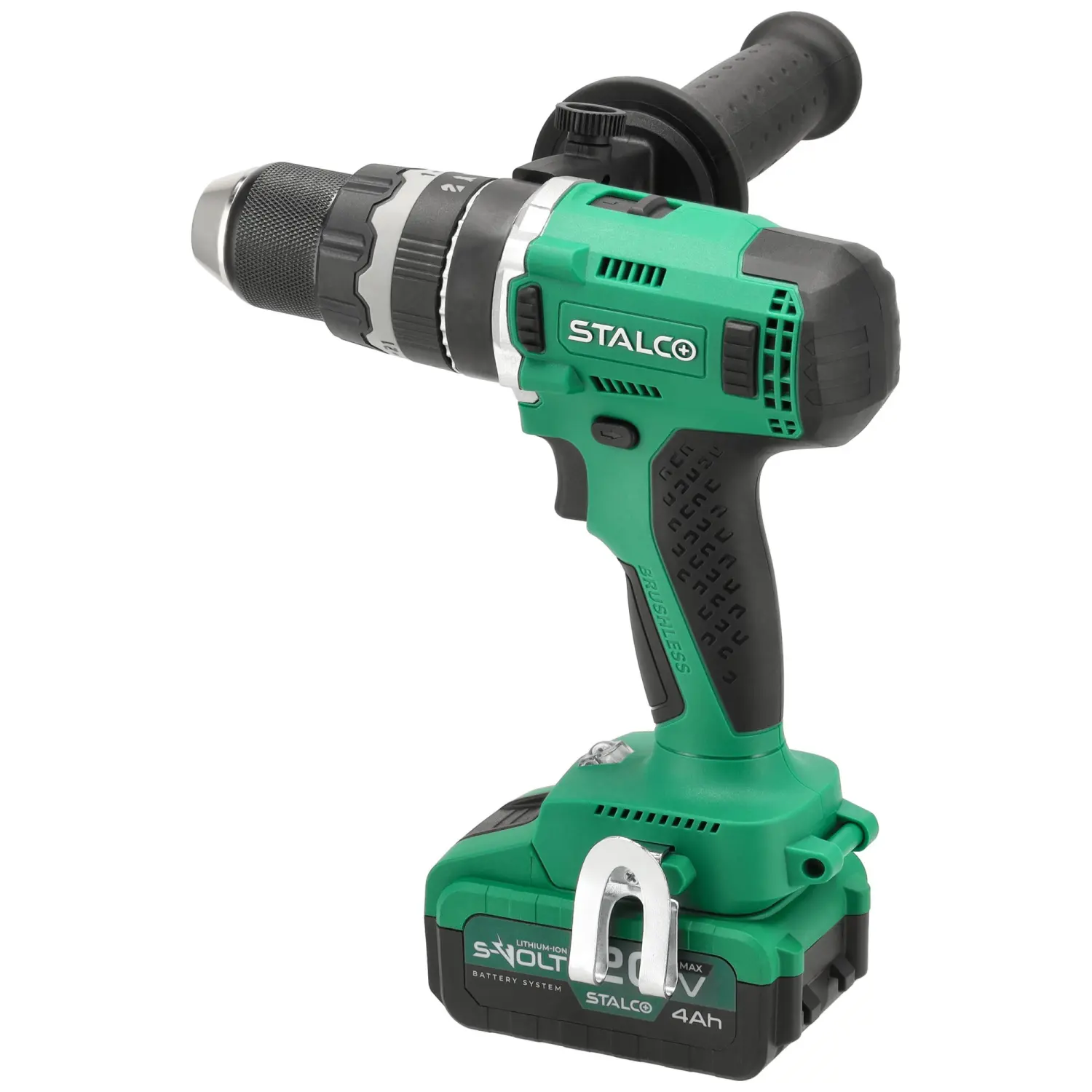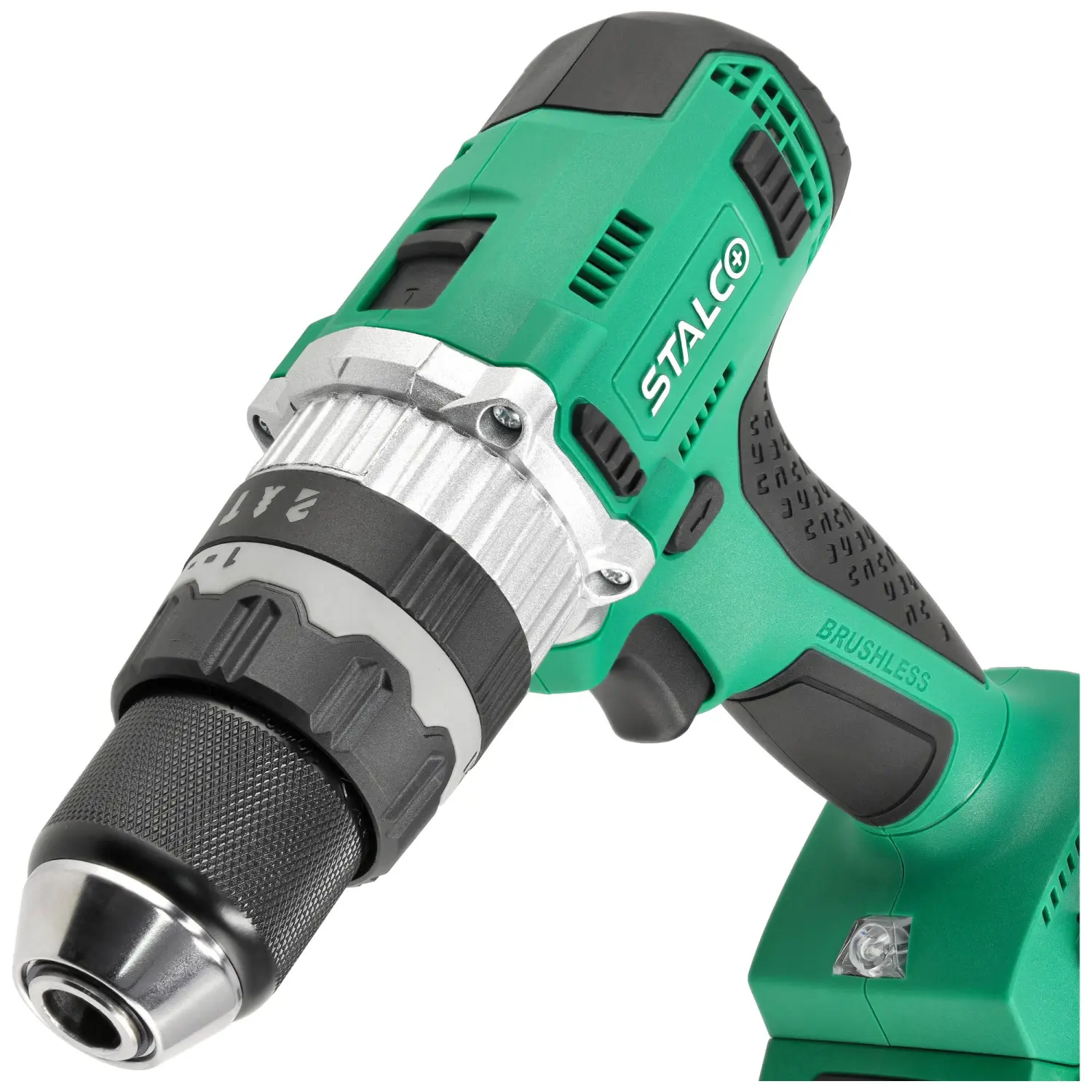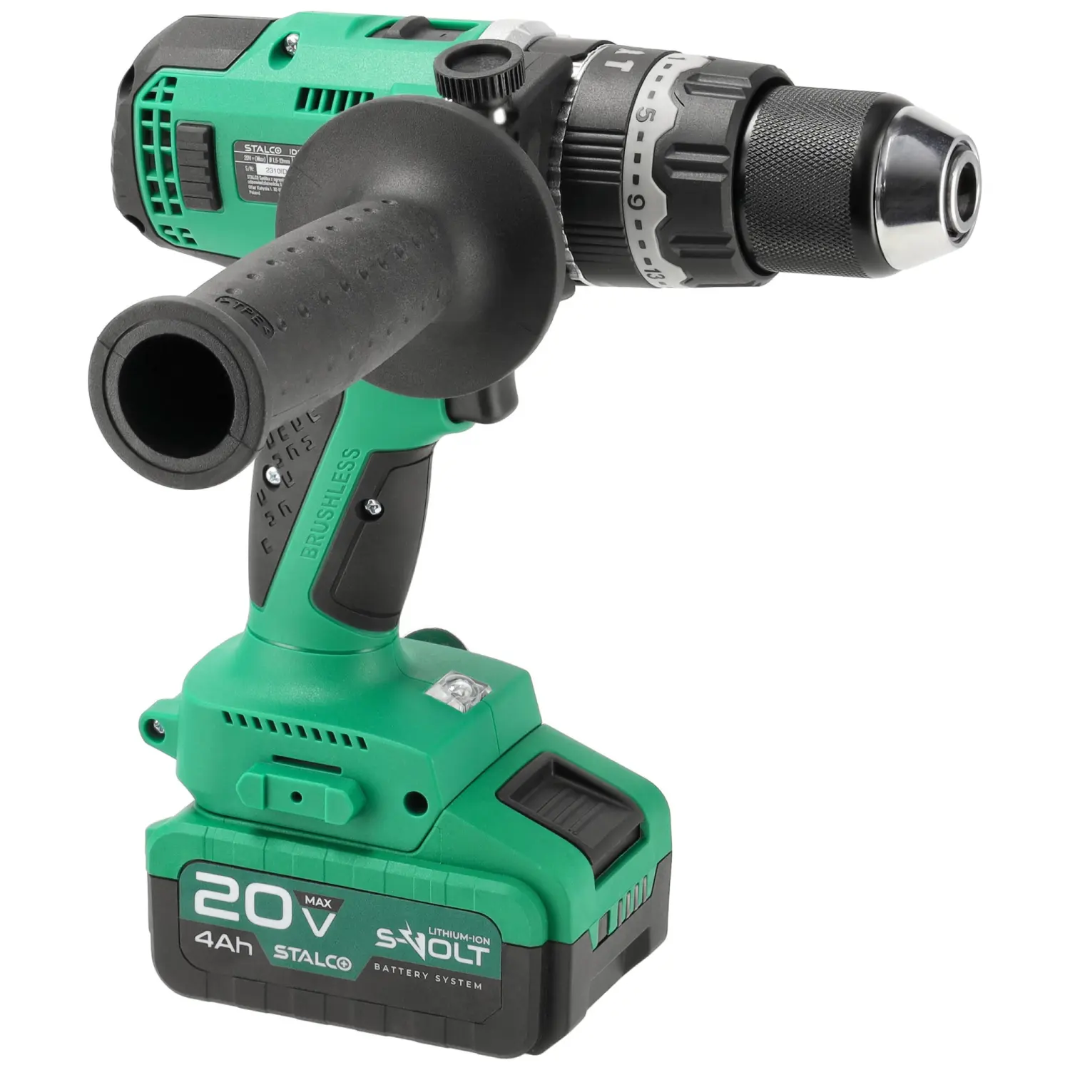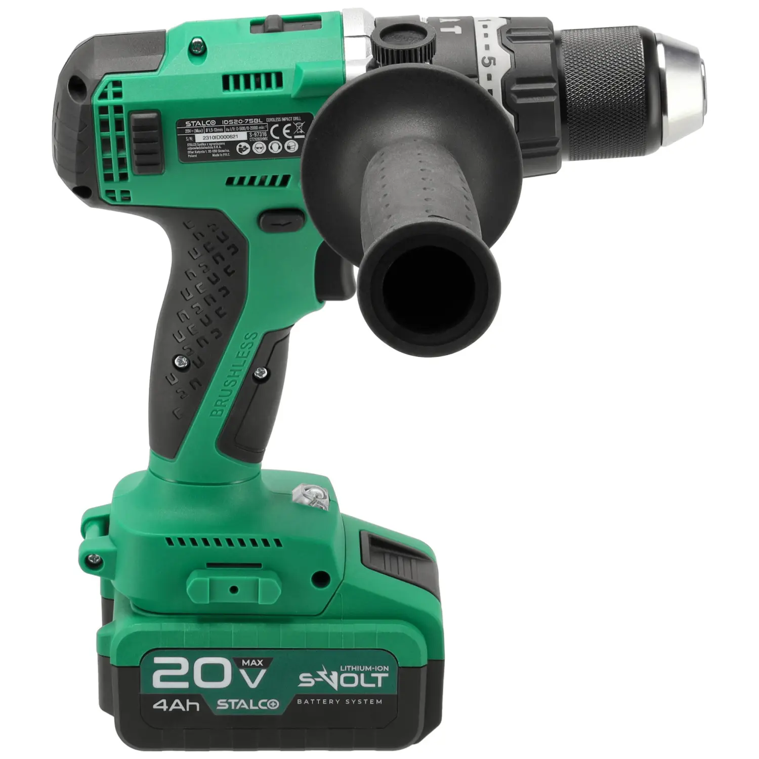 • The IDS20-75BL Cordless Hammer Drill Driver is a highly versatile tool for construction work. It allows drilling in various materials, including wood up to 40 mm in diameter and steel up to 16 mm. The hammer function makes drilling in concrete easier, and the additional handle helps during operation. The rotating head is equipped with a drill chuck for different types of accessories, suitable for drilling and grinding. The device has a brushless motor, which extends its lifespan. Due to its versatility, the Cordless Hammer Drill Driver can be used by professional builders, installers, or service teams. The robust gearbox allows operation in tough conditions and transfers a torque of up to 75 NM. The STALCO Cordless Hammer Drill Driver is powered by a high-capacity 4 Ah battery that charges in less than an hour.