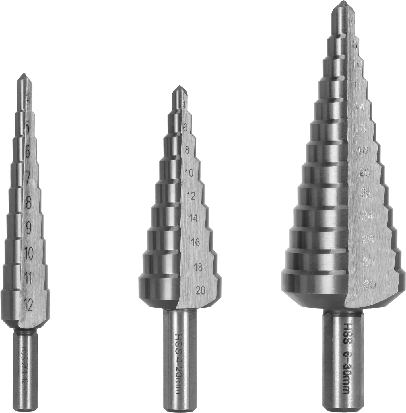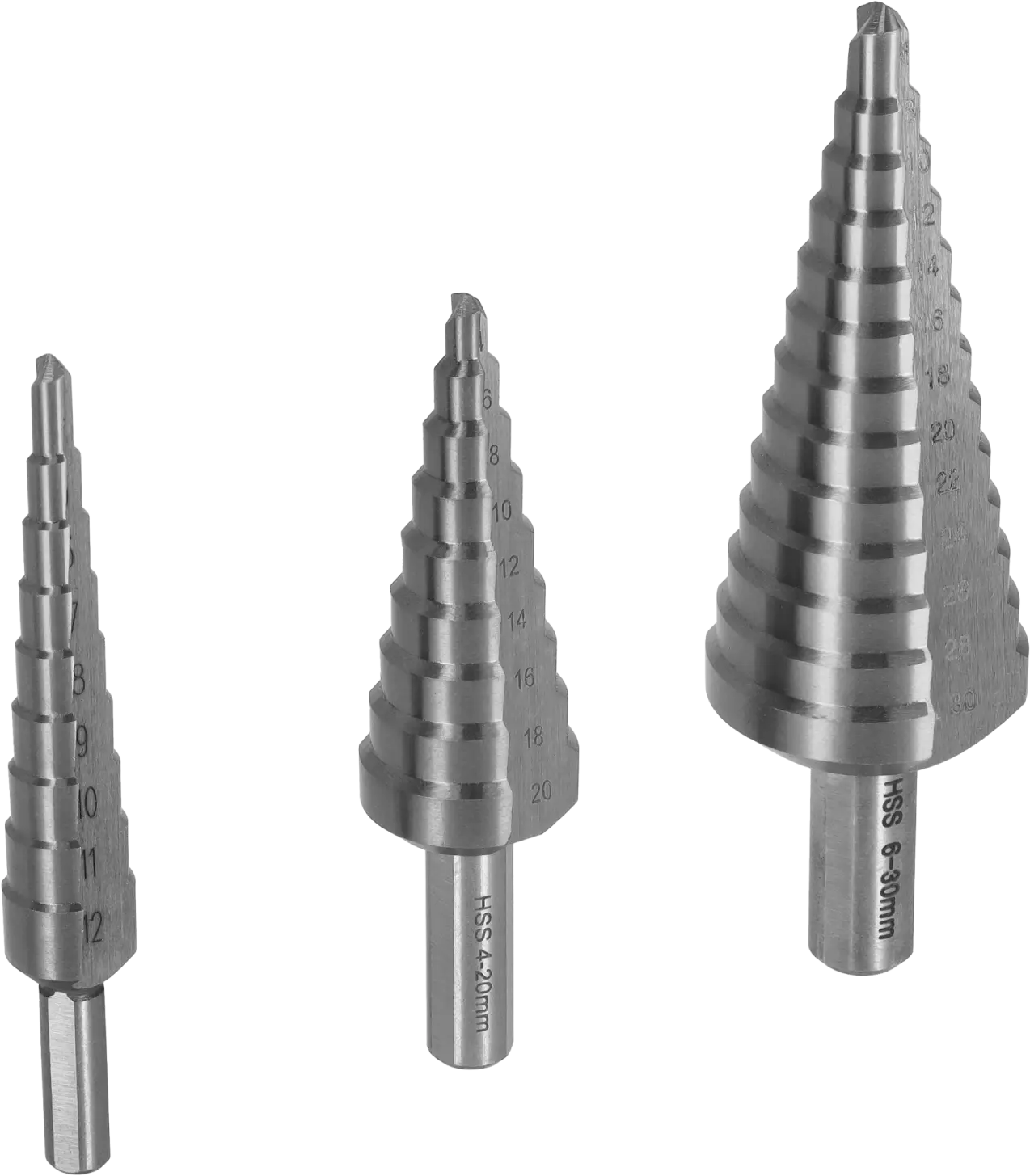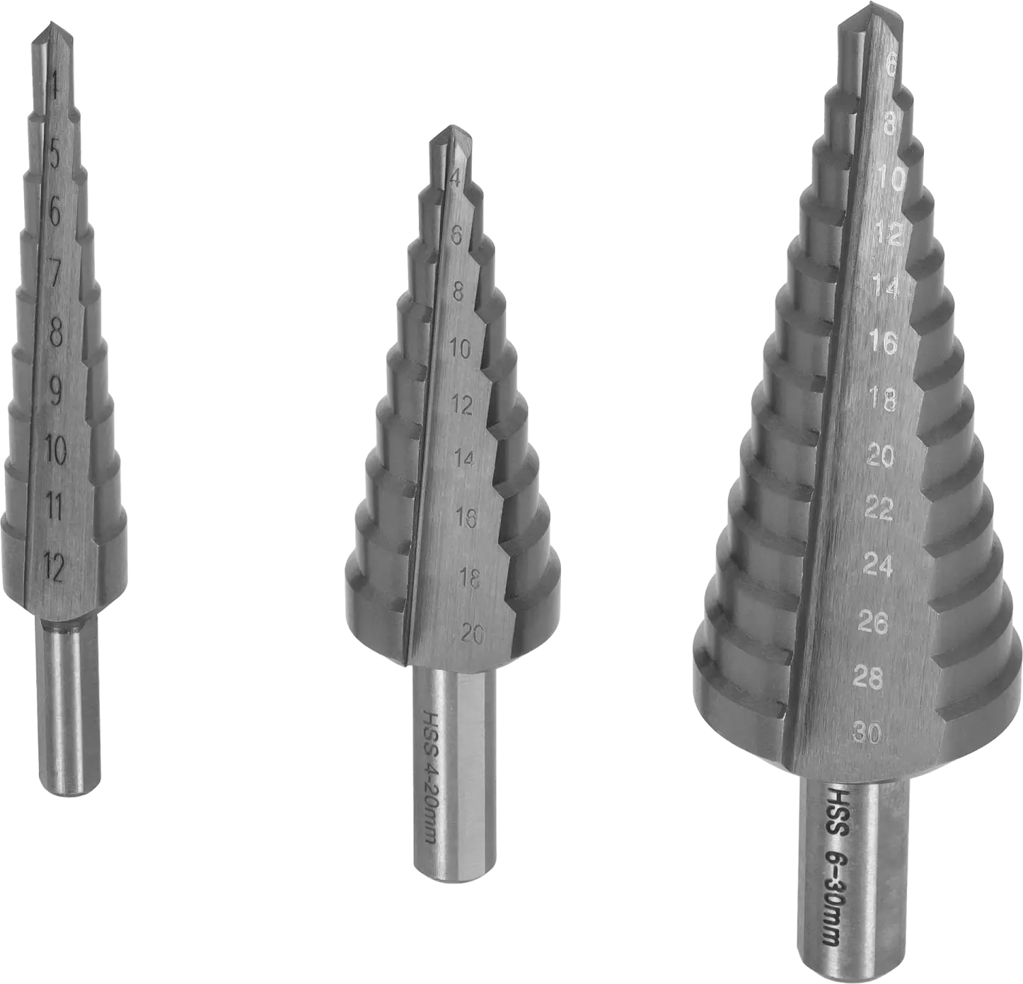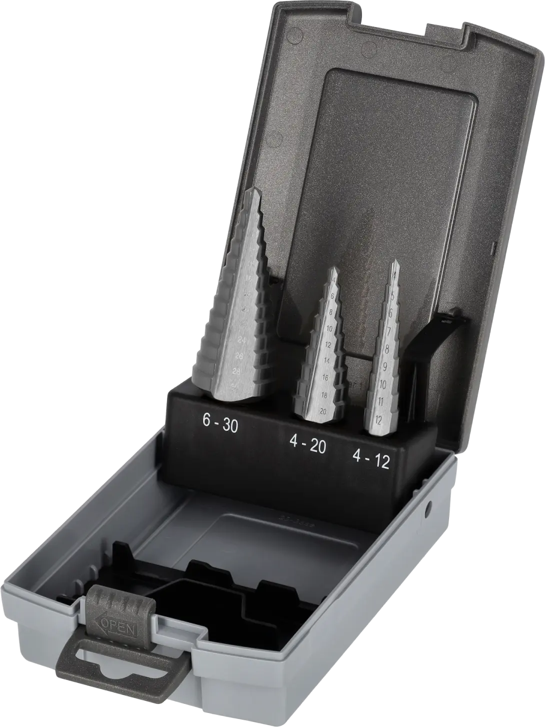 - Set of three step drills ranging from 4 to 30 mm