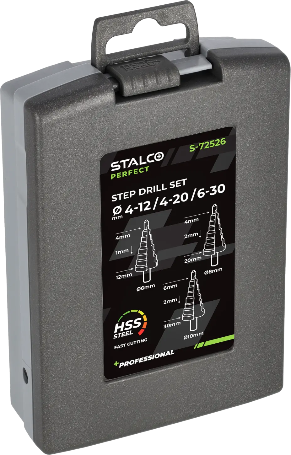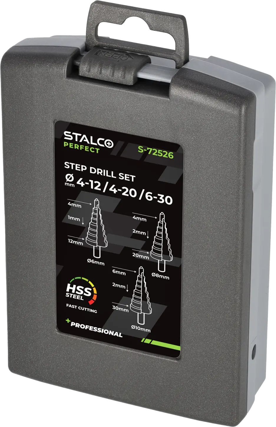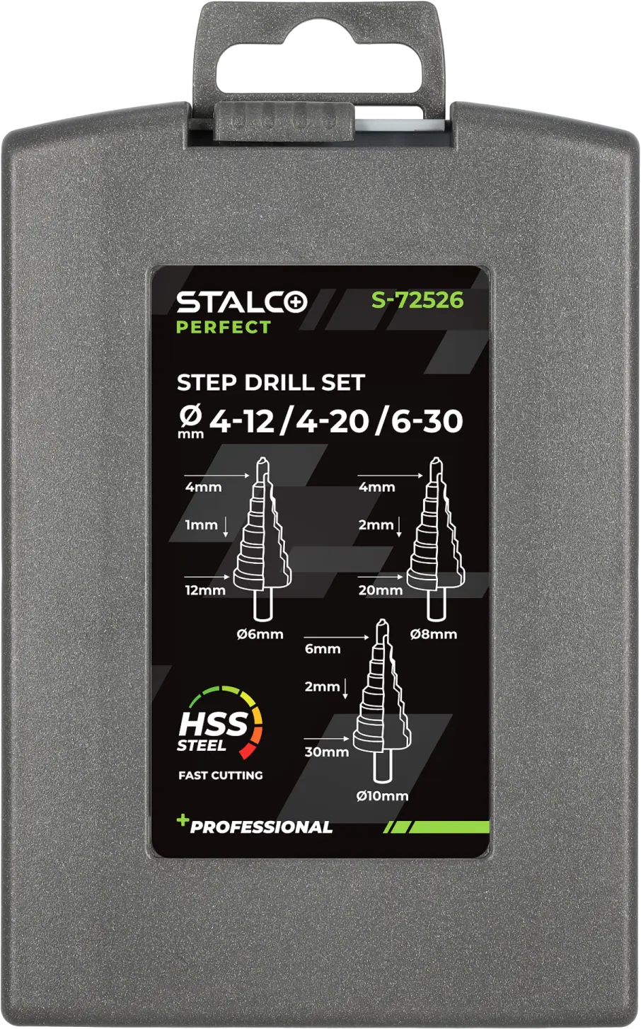 HSS step drills are a very useful product. They are used in professional applications in industry, metalworking, and construction. They allow you to drill holes of selected diameters, enlarge existing ones, create preliminary points for further processing, and even mill edges. They are equipped with a cylindrical shank that can be attached to the chuck of a drill, screwdriver, or even some milling machines. STALCO PERFECT HSS step drills are made of HSS high-speed steel. The ground spiral flute reduces vibration, resulting in precise work. It also facilitates rapid chip removal. Thanks to the axial grinding of the element, the drills leave very smooth edges. The set includes three drills made of HSS high-speed steel. The drills vary in diameter range and pitch. All three drills are supplied in a durable plastic case for safe storage.