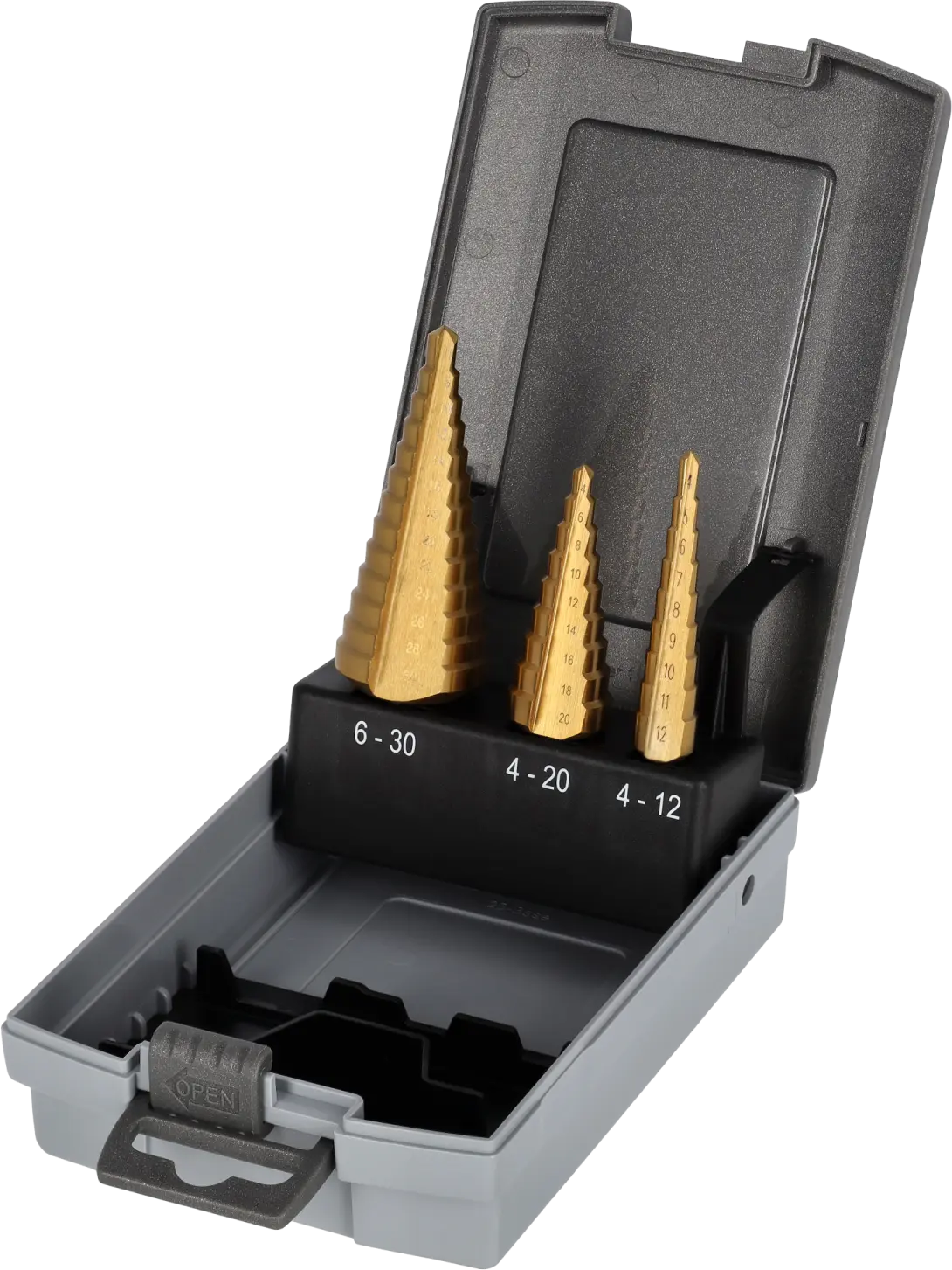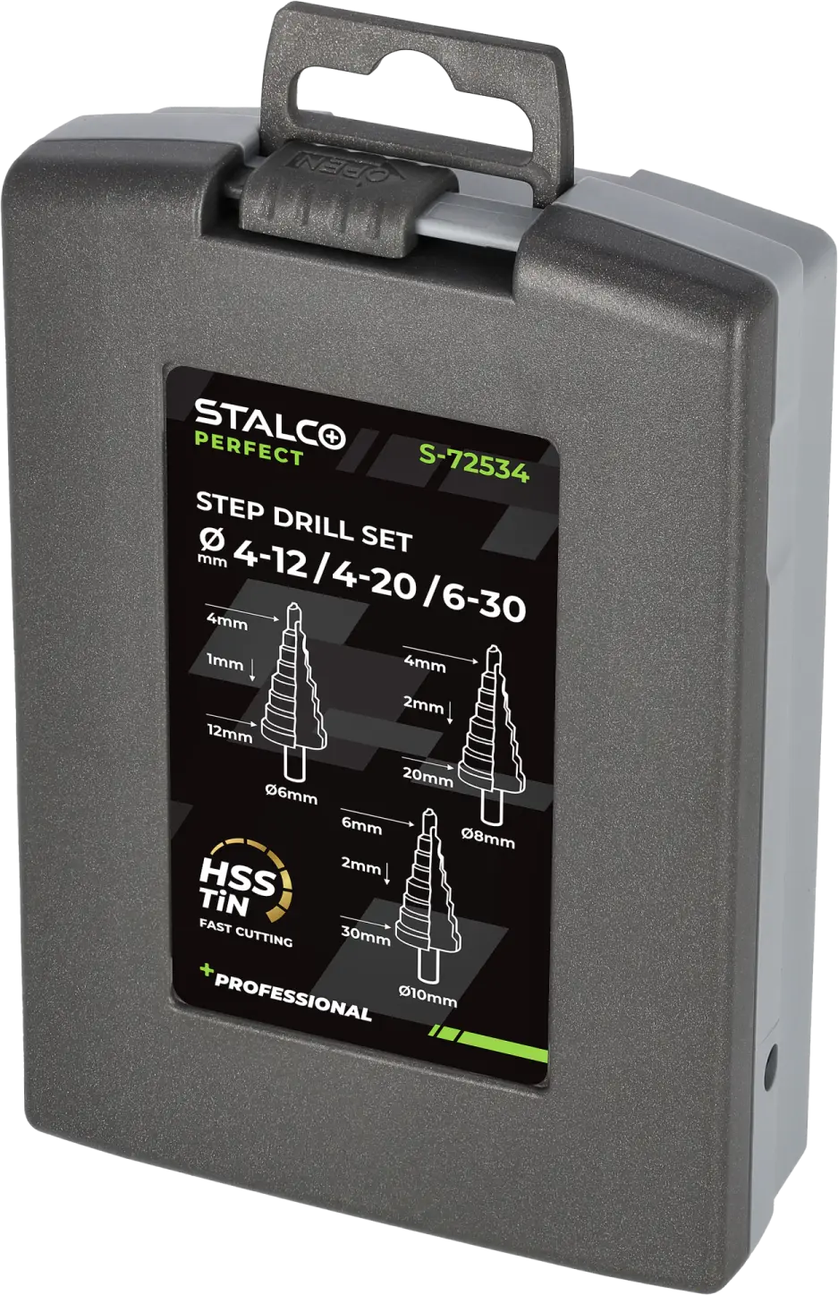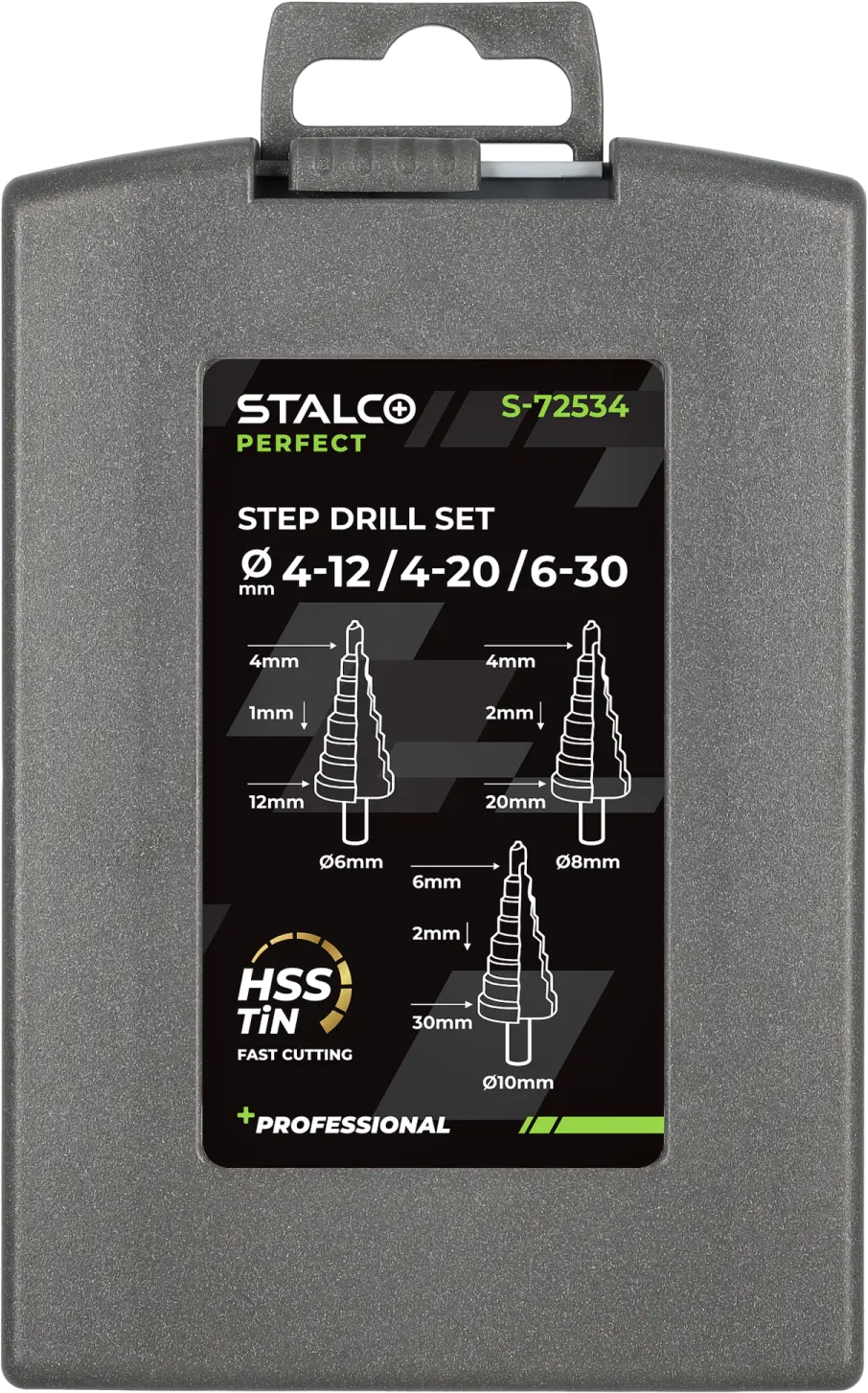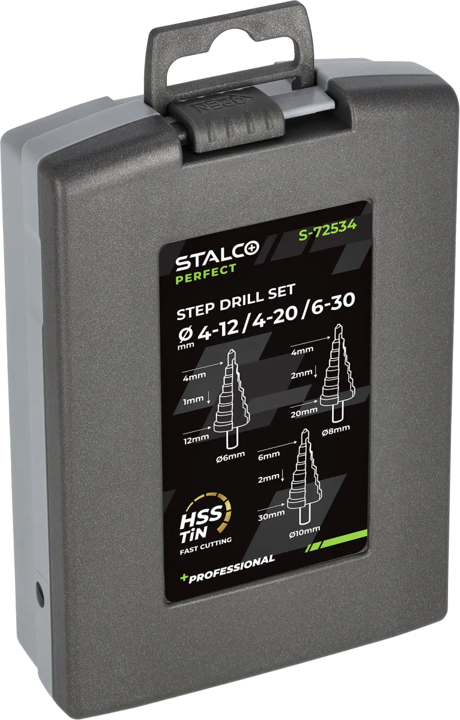 For the most demanding metalworking jobs, an HSS-TiN step drill bit can be indispensable. This power tool accessory is used for enlarging holes, centering drill holes, or milling interior edges. It can be operated with screwdrivers and drills equipped with cylindrical chuck jaws. The STALCO PERFECT HSS-TiN step drill bit is useful for demanding and professional tasks. It is made of HSS high-speed steel with a titanium nitride coating, providing high abrasion resistance and enabling work with the hardest metals. A spiral flute for debris removal and a cross-cut grind are formed during manufacturing. The drill bit's dimensions are laser-engraved, making it very comfortable to work with. Furthermore, it leaves a smooth edge inside the hole after drilling. The set includes three drill bits, which vary in diameter and pitch. All three drill bits are supplied in a durable plastic case for safe storage.