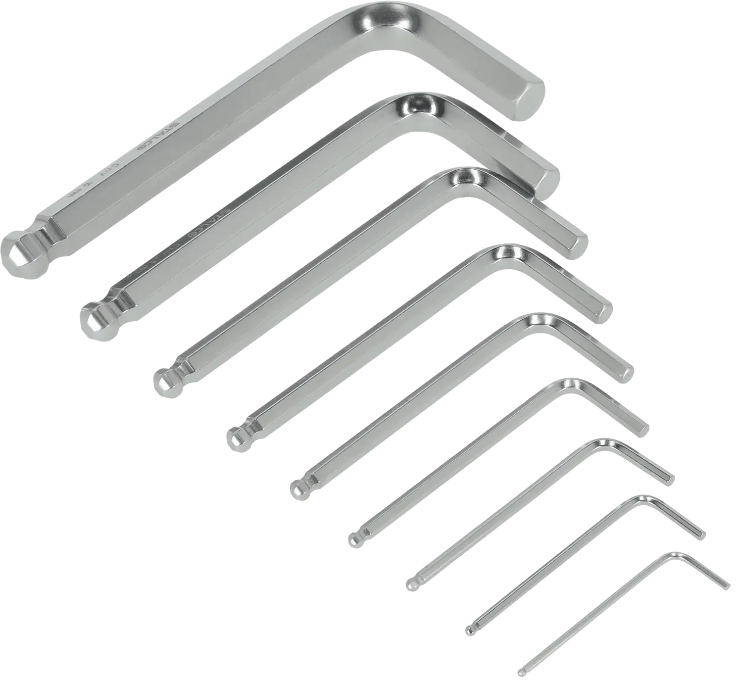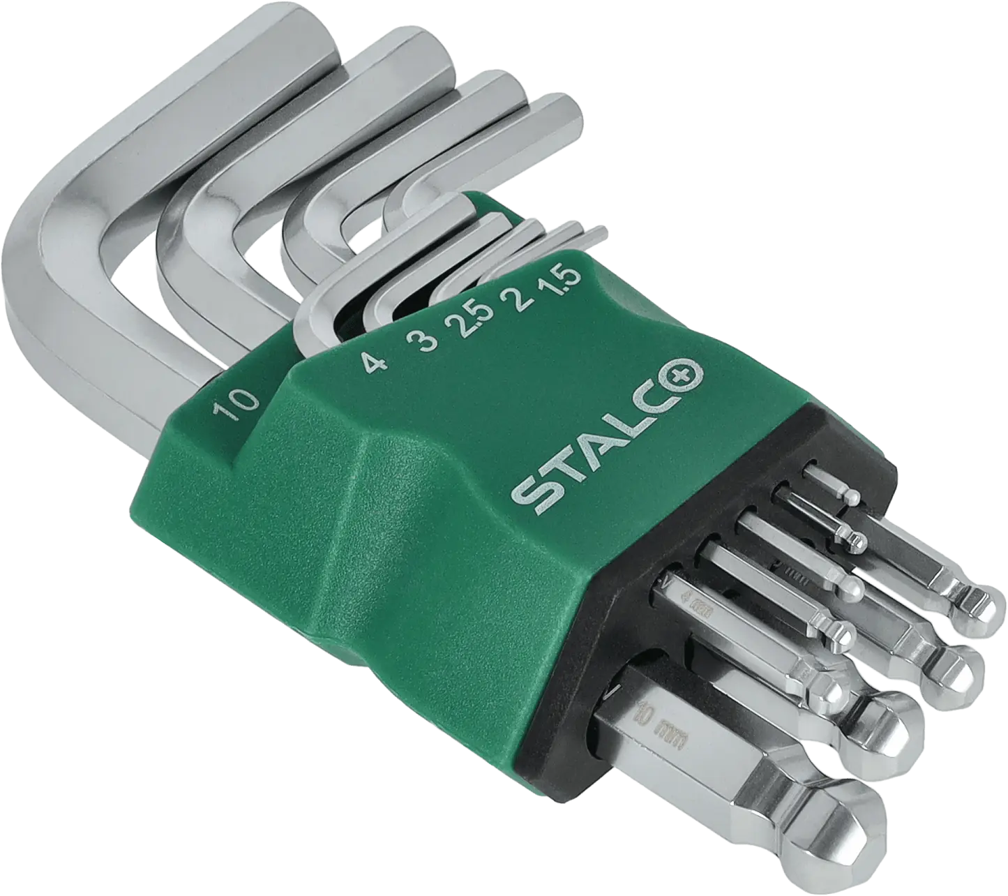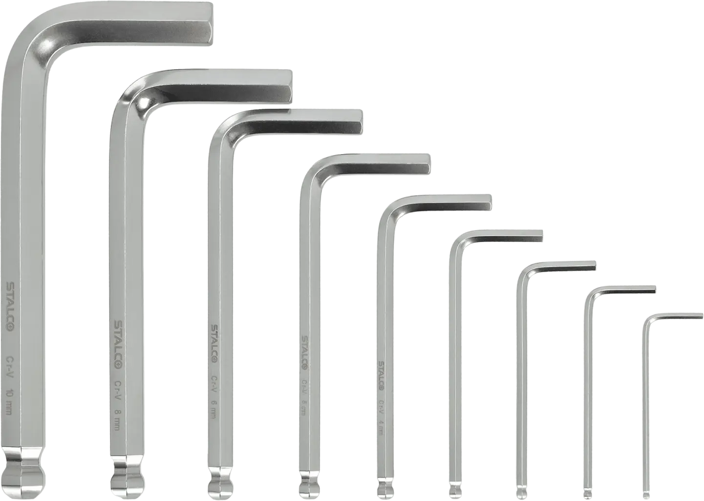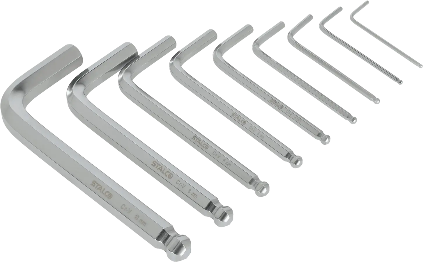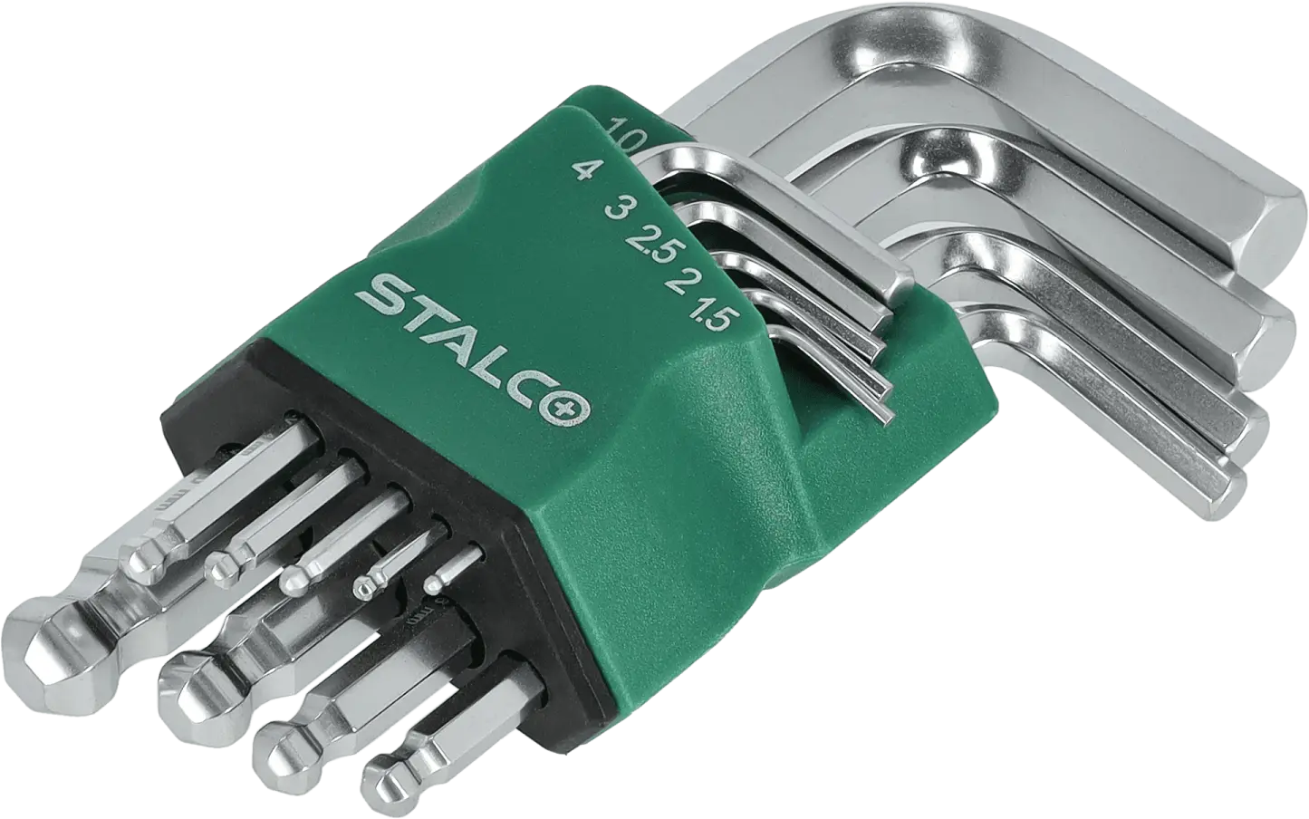 This set of short hexagonal ball-end wrenches is a functional addition to any workshop. It contains nine short-shank Allen keys with standard sizes from 1.5 to 10 mm. The wrenches have a curved design, which increases their versatility. The long end has a ball-shaped tip, allowing for loosening and tightening screws with the shank at an angle to the axis of the fasteners. The STALCO set of short hexagonal ball-end wrenches contains durable and precisely crafted tools. Thanks to the use of chrome-vanadium tool steel, these accessories are resistant to mechanical damage. They are resistant to rapid abrasion, ensuring long-lasting performance. The hexagonal ball-end wrenches are housed in a handy case into which each element can be inserted.