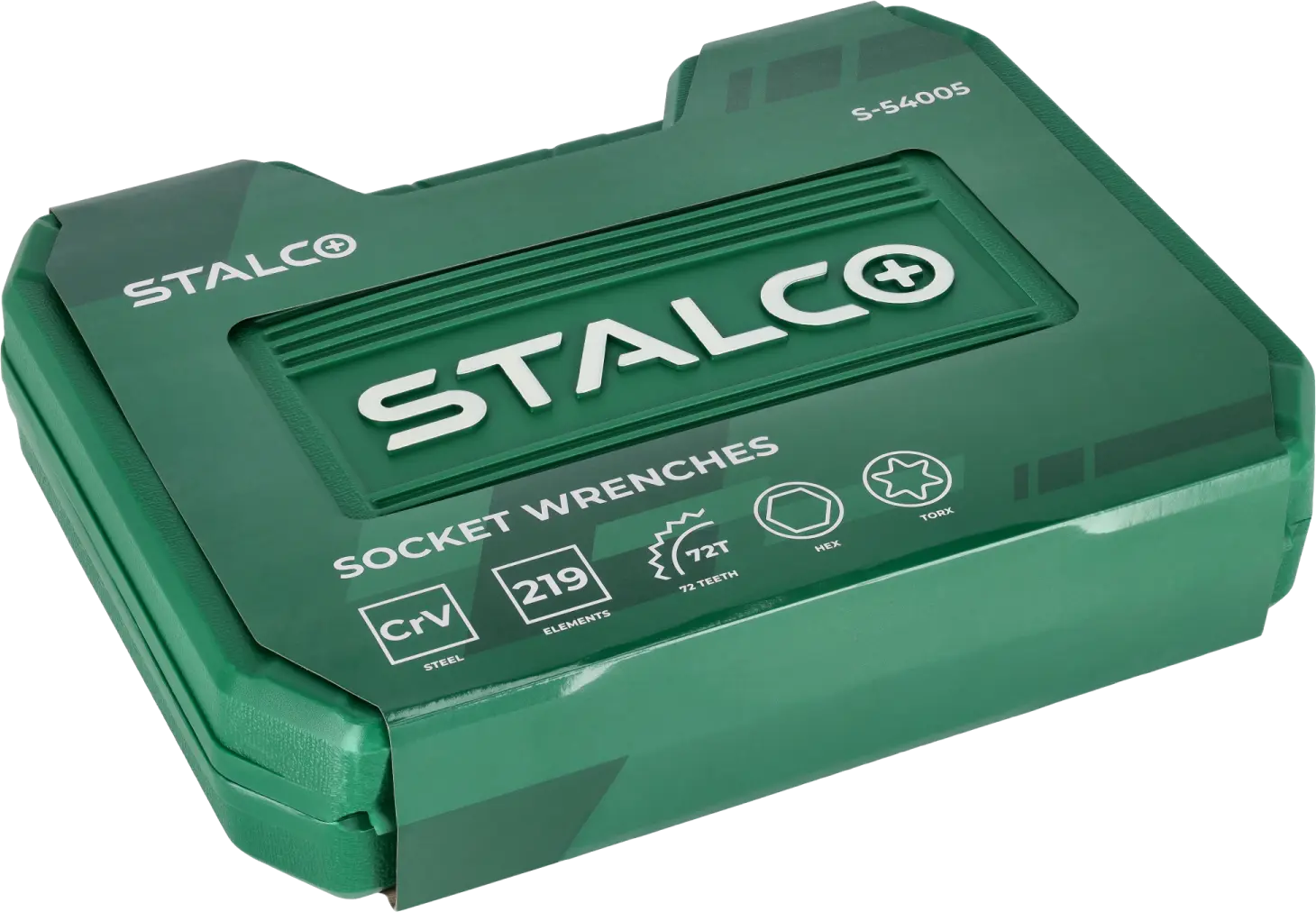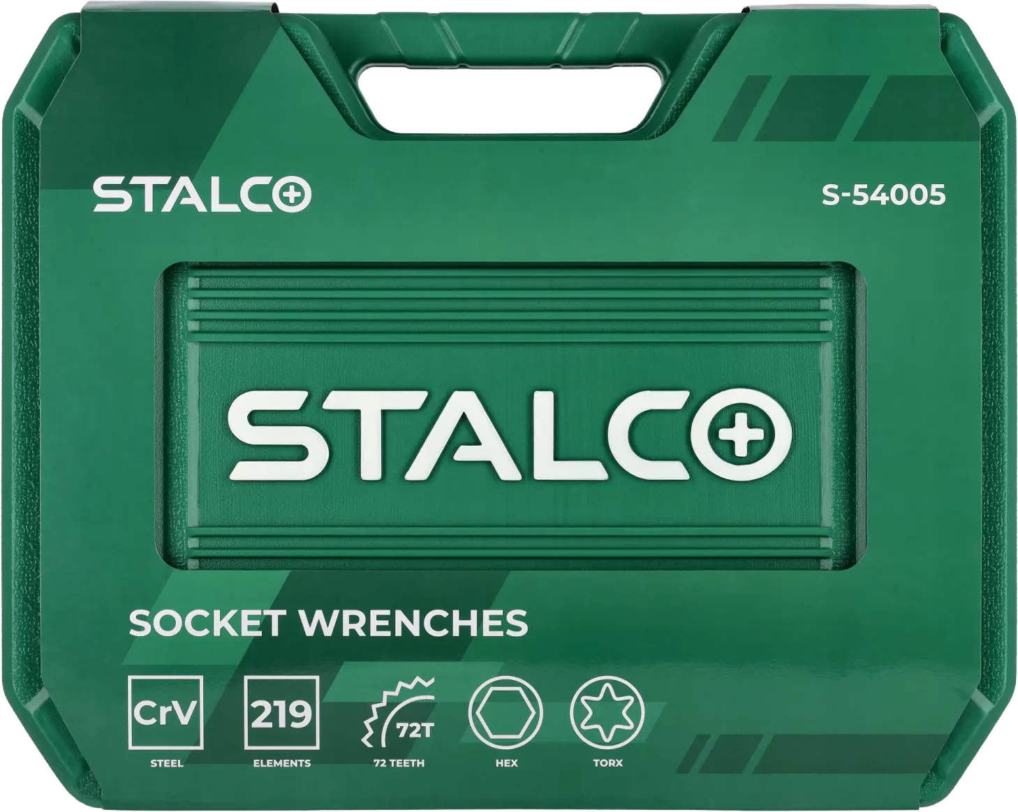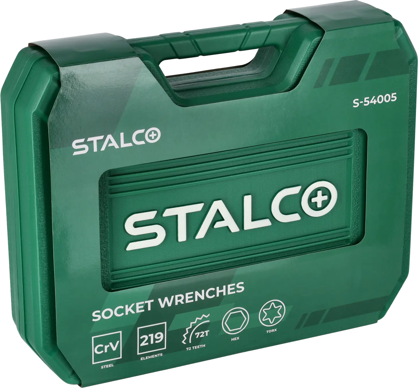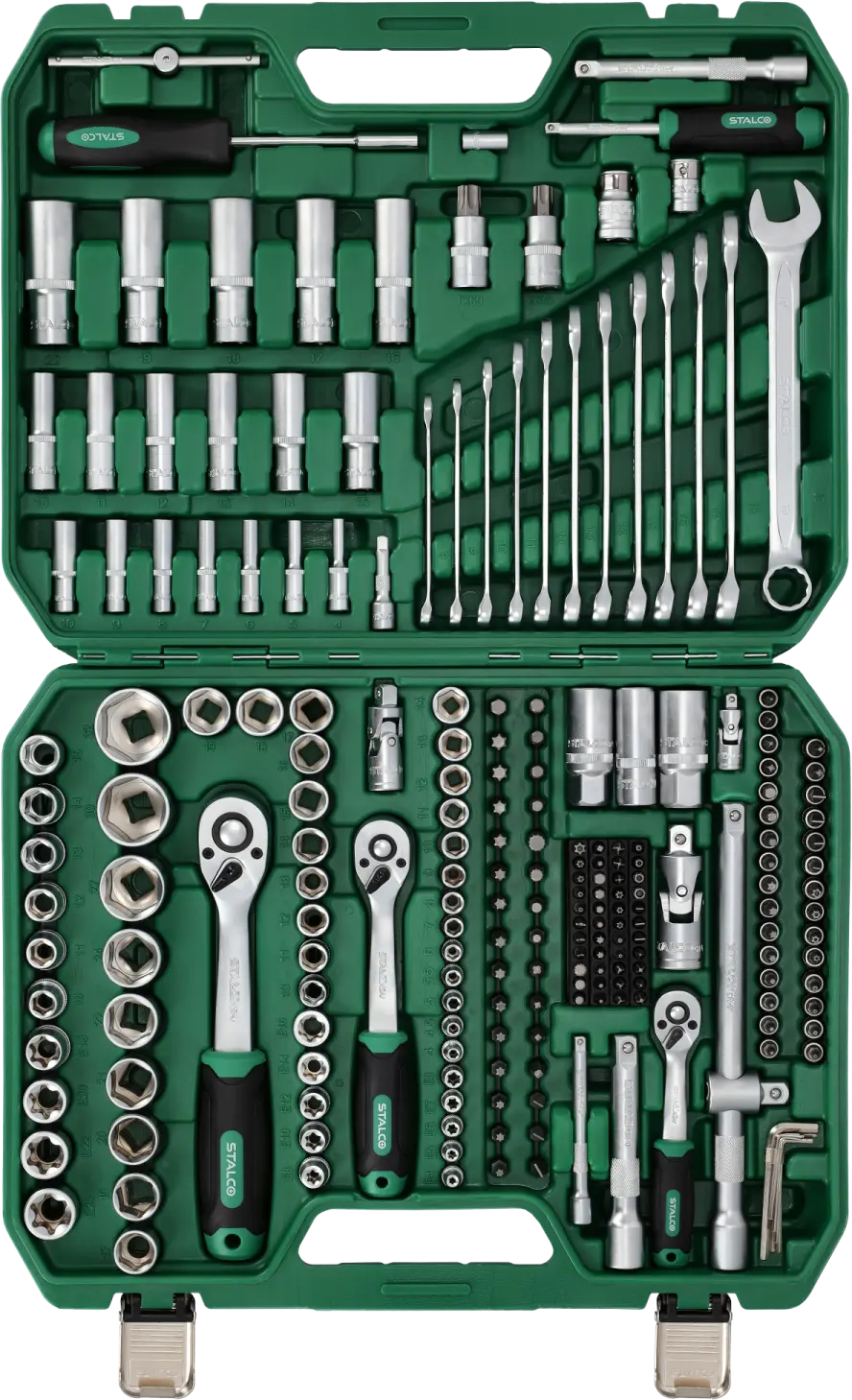 This extensive set of socket and combination wrenches will be useful in any workshop. It contains 219 pieces, making it one of the most comprehensive in the entire STALCO tool range. It includes accessories and tools necessary for working with screws and bolts. You can customize the components to fit fasteners with sockets and handles in various shapes and sizes. The set of socket and combination wrenches includes a full set of sockets for screws ranging from 4 to 32 mm. The sockets fit 1/4-, 3/8-, and 1/2-inch shanks. They are also available in two lengths. Flat-head, Phillips, and TORX bits are used for screwdriving. The set also includes combination wrenches, ratchets, a screwdriver, and a range of additional tool accessories. All items are housed in a plastic, buckle-fastened case.