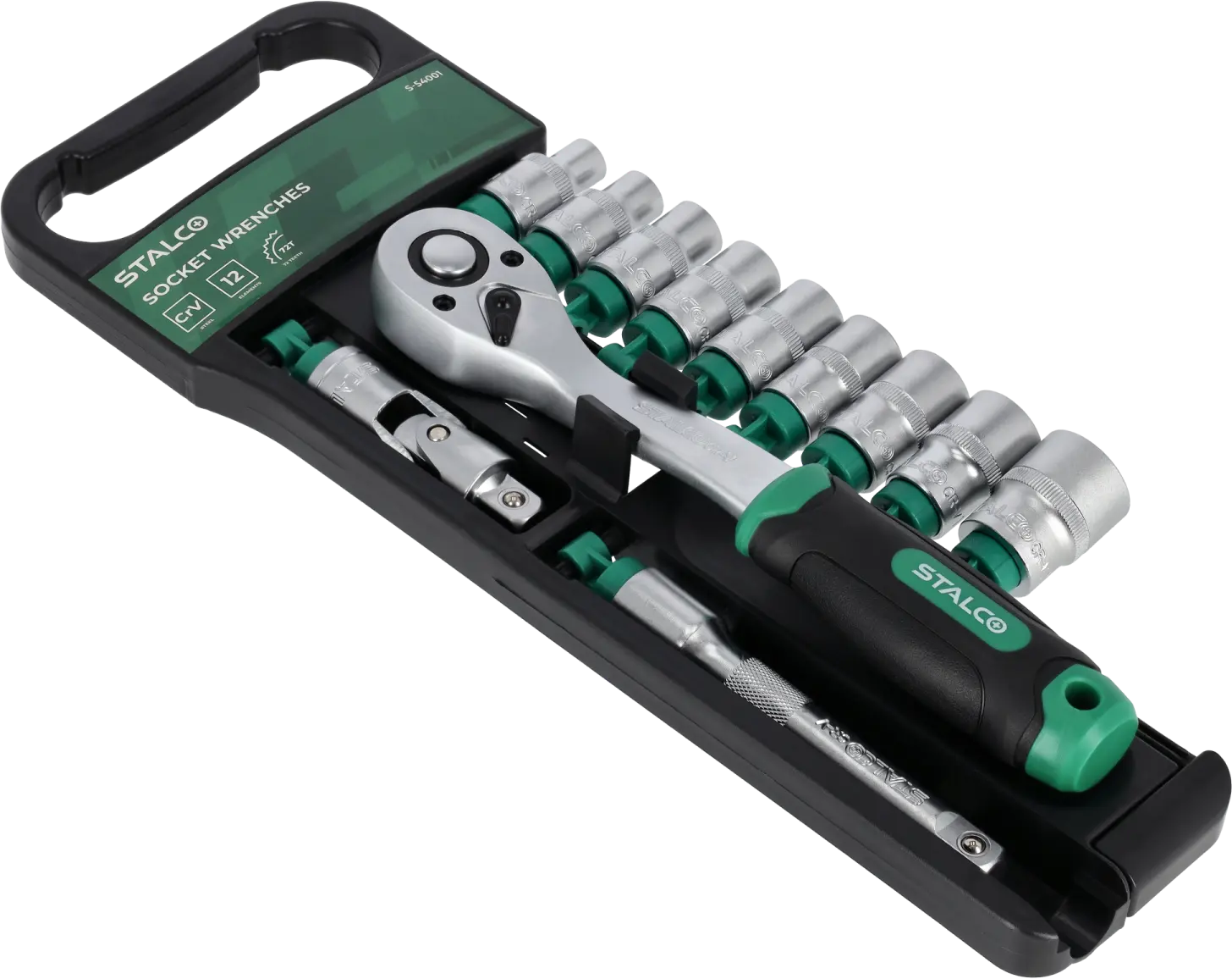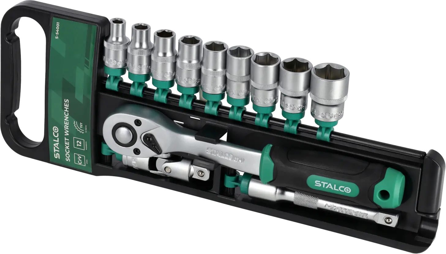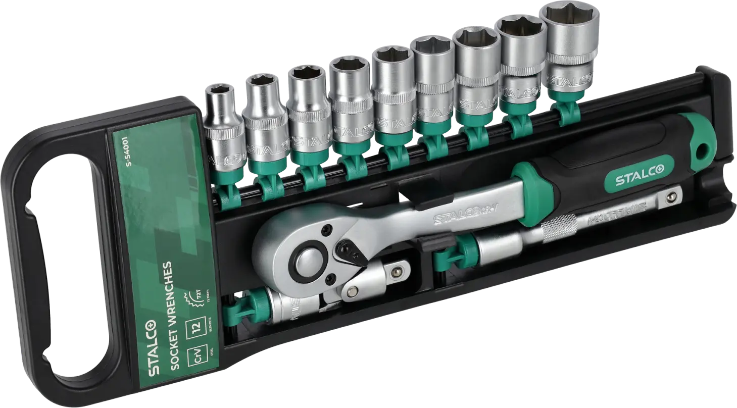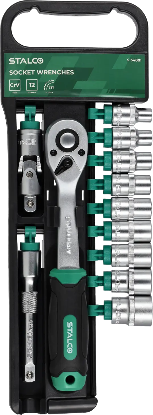 The sockets and ratchet on the hanger offer numerous applications in mechanical work. This set is primarily useful in mechanical workshops, construction projects, and various craft projects. The STALCO sockets and ratchet on the hanger allow for handling screws, bolts, and other threaded fasteners. The set includes nine sockets in various sizes, an extension, a joint, and a ratchet. All components are designed to handle half-inch connections. The tools are durable and resistant to corrosion and accidental damage, thanks to the chrome-vanadium steel used in their construction. All the set components are stored on the hanger, making them easy to keep organized and transport to any desired location.