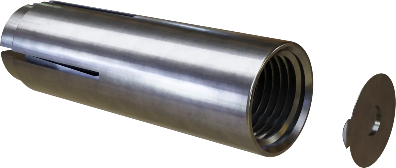 A steel expansion sleeve that can be used for a variety of construction projects. It is manufactured from carbon steel and protected with zinc plating. The sleeve is divided into quarters, which expand inside the hole after the rod is installed. The sleeve's short length works well even in thin walls.
