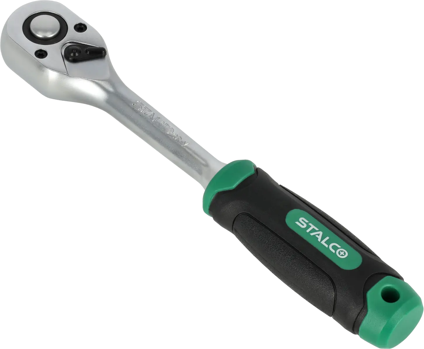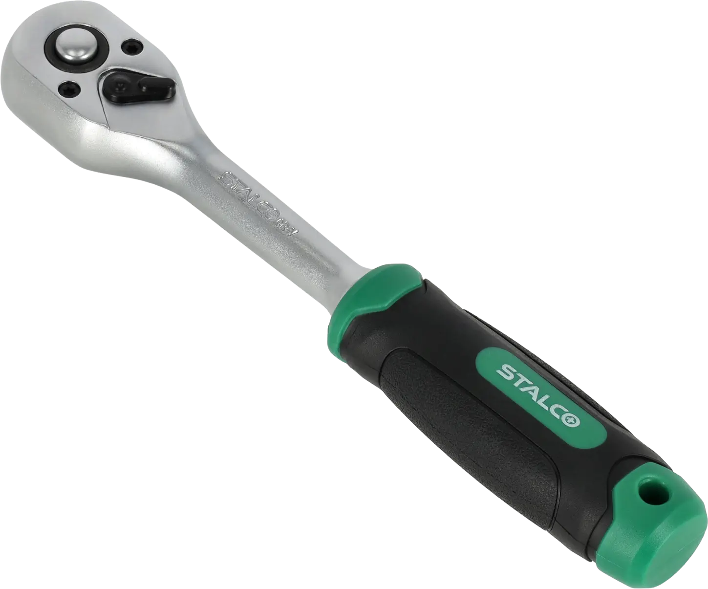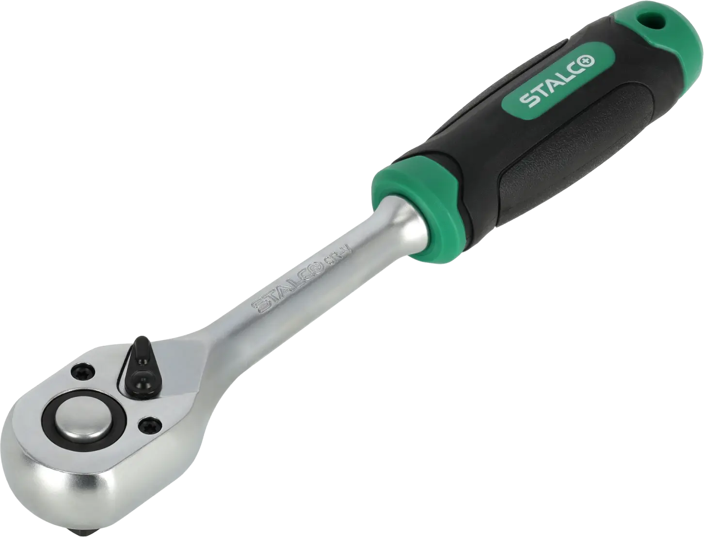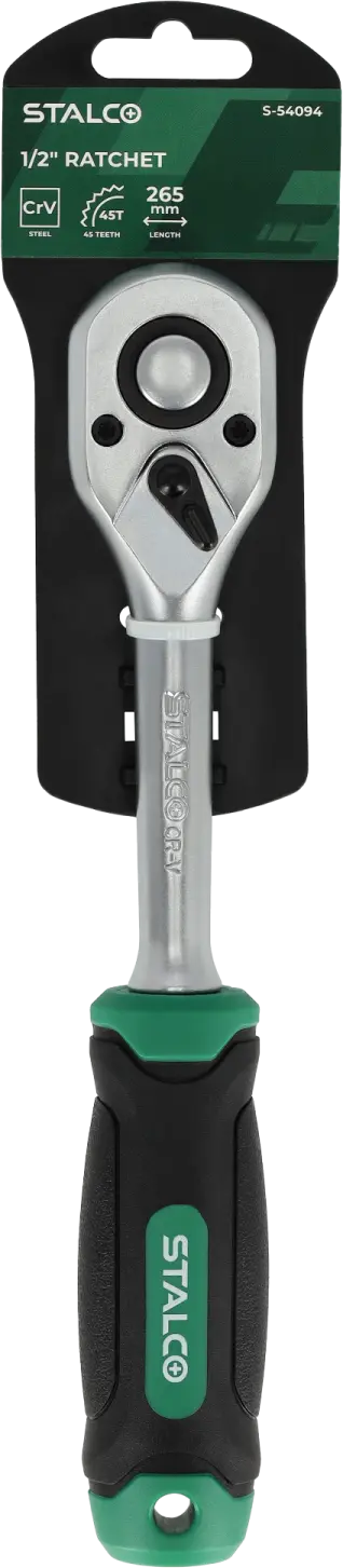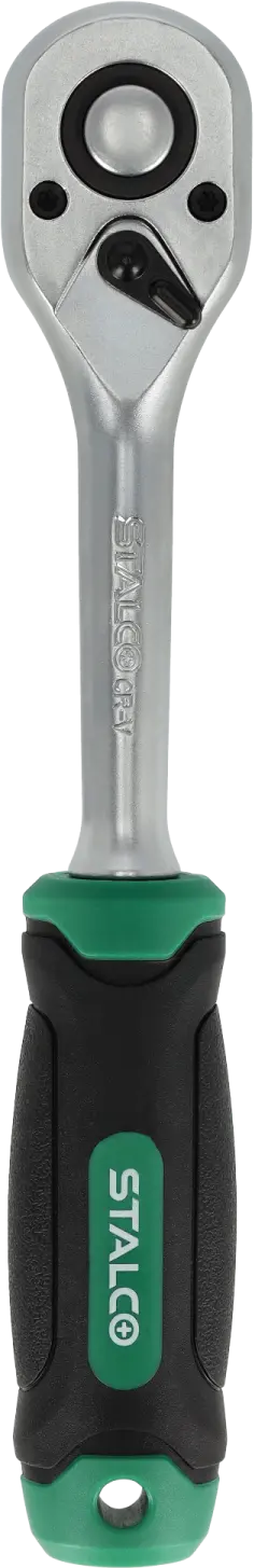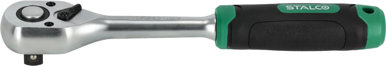 The straight ratchet is a hand tool useful for many tasks. It is equipped with a shaft designed for mounting sockets and accessories with sockets. It is suitable for tightening and loosening threaded elements. It can be useful during construction, mechanical, and assembly work. The STALCO straight ratchet is equipped with a 45-tooth ratchet mechanism, allowing for quick and powerful tightening of accessories. A lever for reversing the ratchet action is located on the top of the ratchet. The tool is made of chrome vanadium steel, which makes it resistant to mechanical damage and corrosion. The ergonomic handle allows for a secure hold even during intense work. The straight ratchet in the STALCO range is available in three variants, with working shafts of 1/4, 3/8, and 1/2 inches.