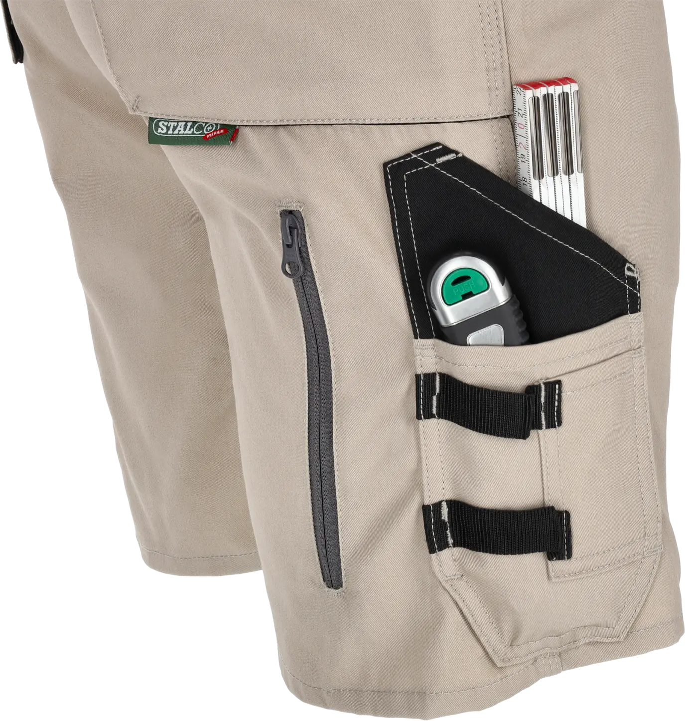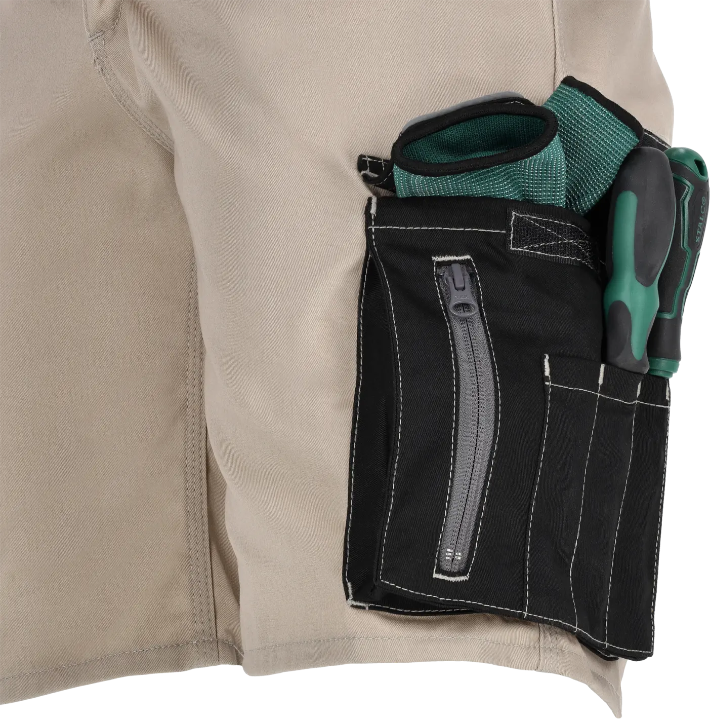 The shorts feature a number of functional pockets for small items and personal items. There's a bellows pocket for your phone, and a zippered document pocket even has a place for your ID. The shape and location of the remaining pockets make it easy to store a hammer, tape measure, or pen. Additionally, two assembly pockets on the trousers are zippered, so they can be used as a replacement for a tool belt.