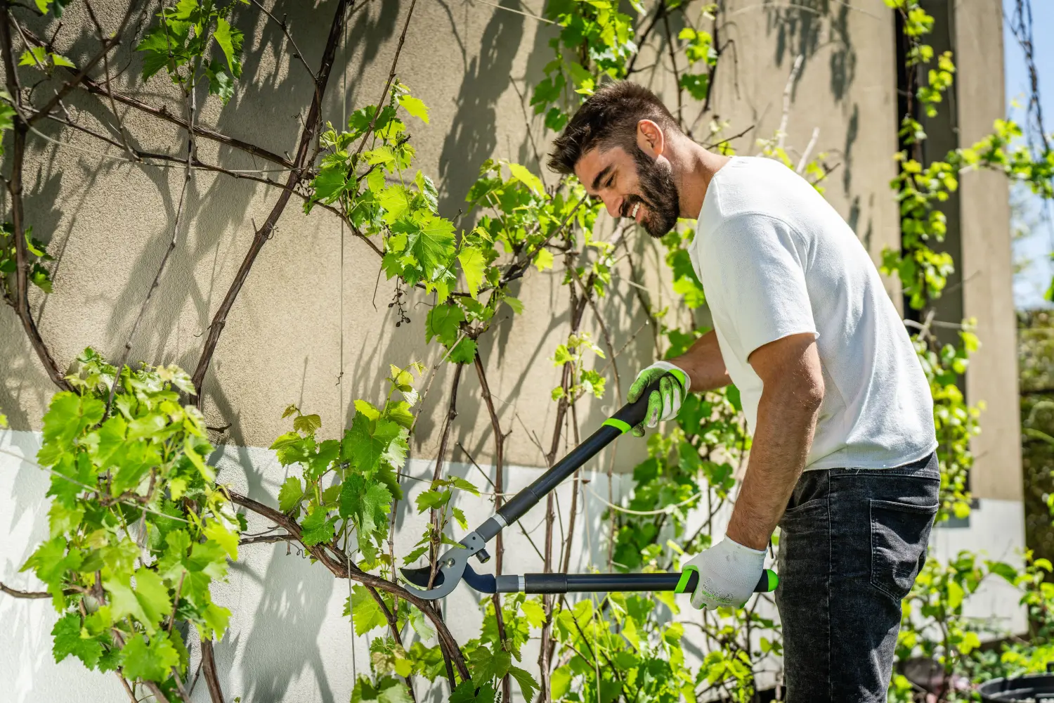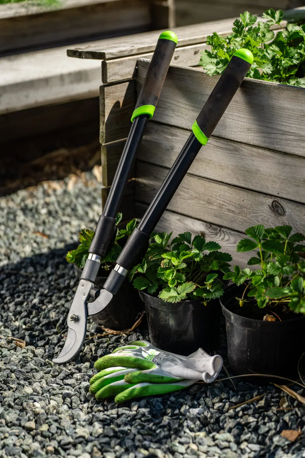 Pruners, shears, and saws are used for maintenance pruning and care of plants.