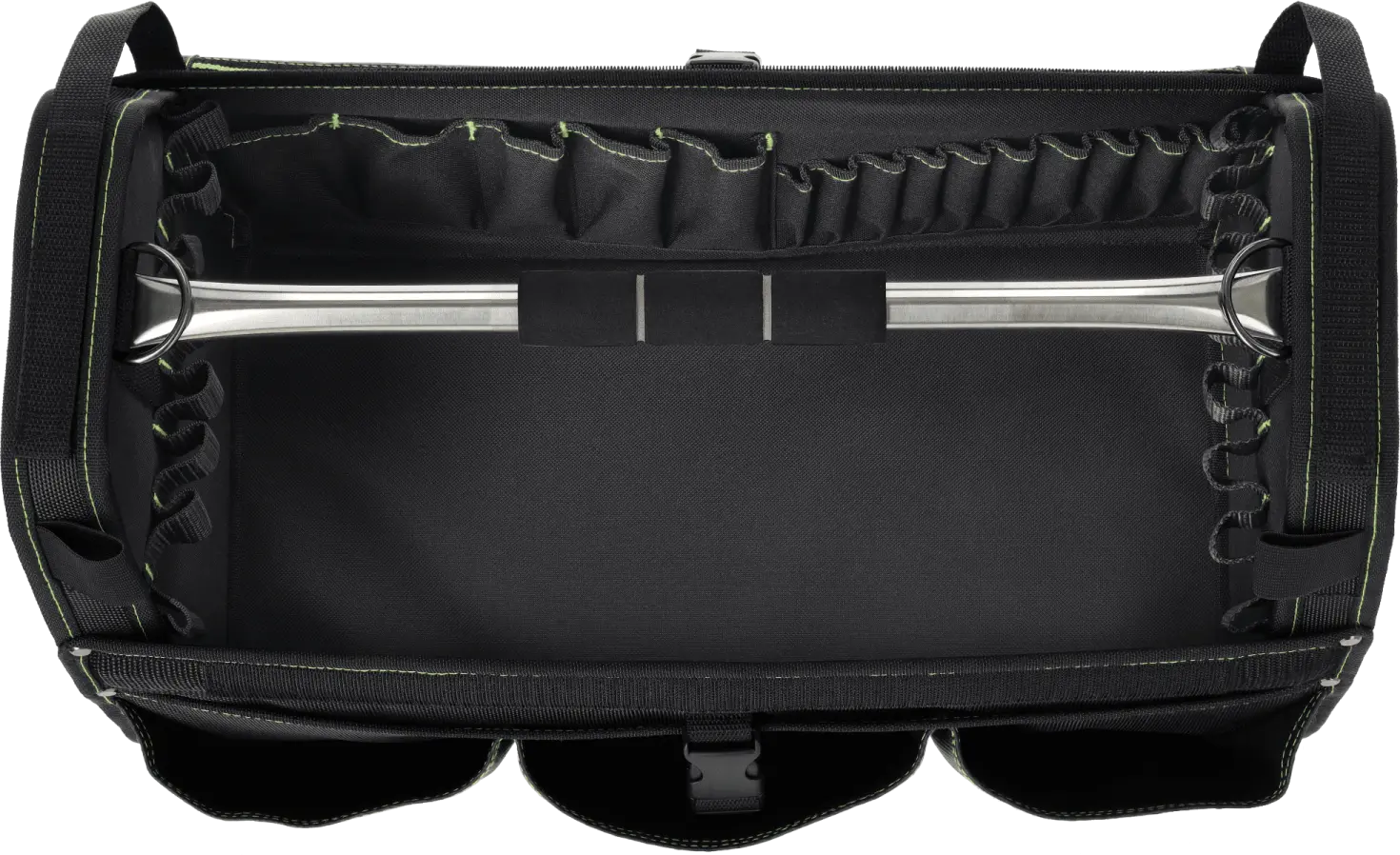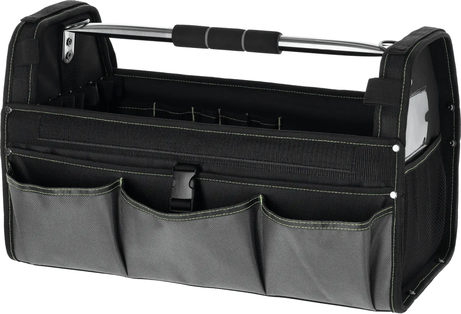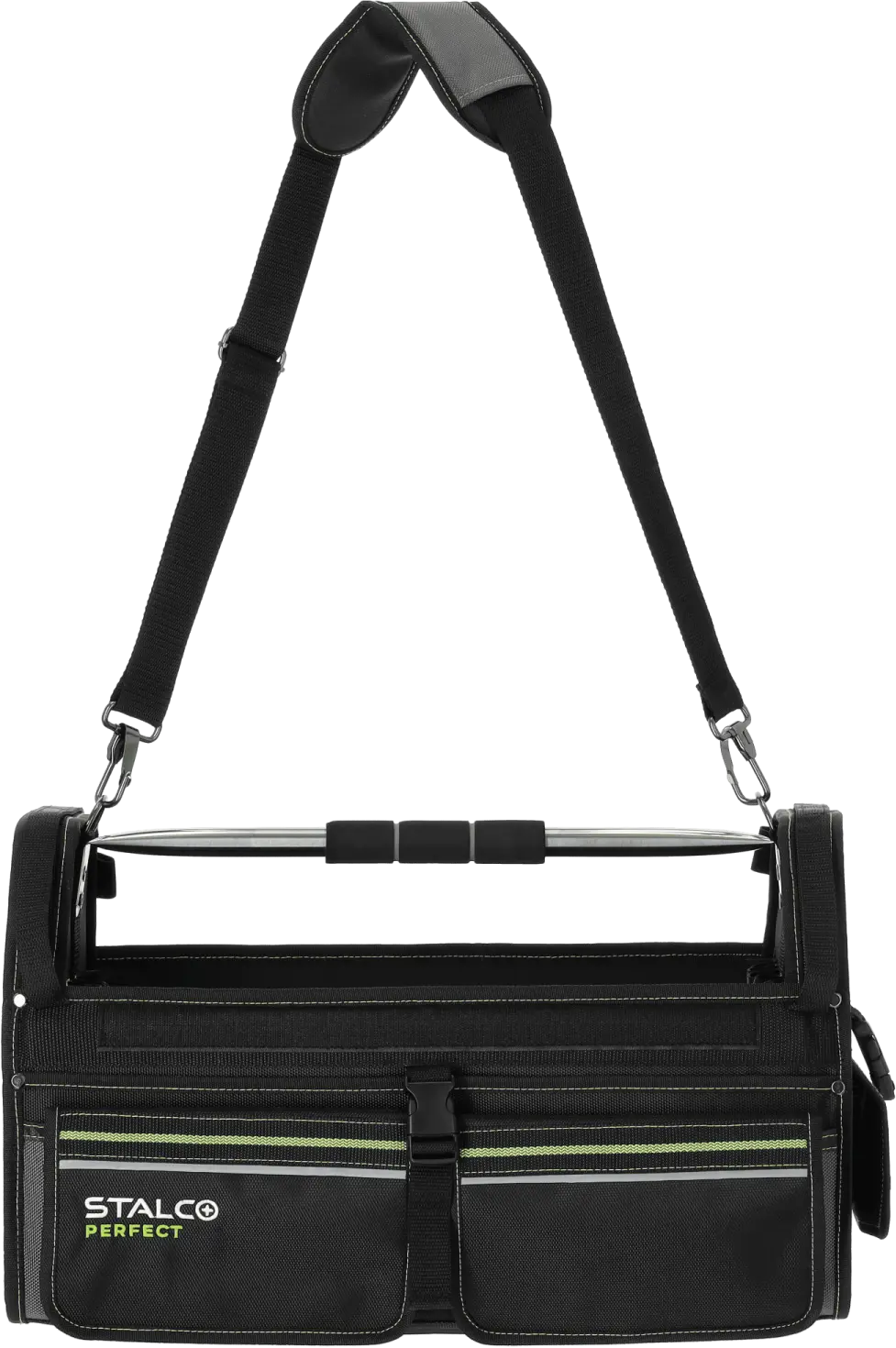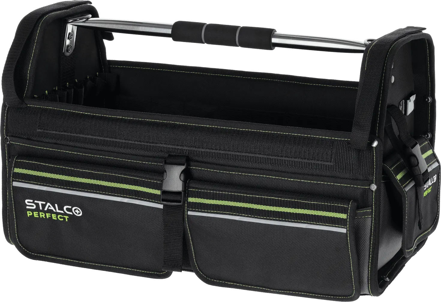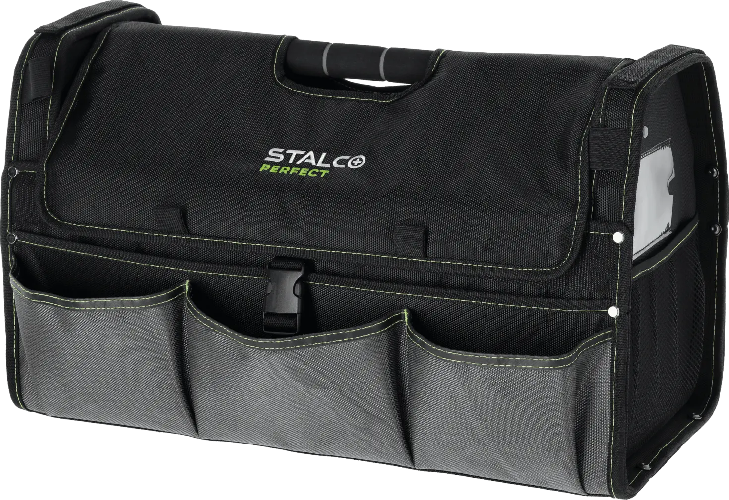 Among the essentials for professional service crews, the TNP32 tool bag is a must-have. It's a useful product for carrying handy tools and additional accessories. The bag is very spacious, measuring 51 x 25 x 32 cm. The main compartment can hold a lot of equipment, and 23 additional internal pockets allow for the neat storage of small accessories. Nine additional pockets are designed around the outer perimeter. Additionally, the exterior features a tool clip and a slot for an ID badge. The TNP32 STALCO PERFECT tool bag can be carried by hand, using a contoured handle covered with soft foam. It is made of durable polyester fabric that is resistant to mechanical damage and abrasion. The main section is fastened with a durable zipper. The bottom is reinforced with two plastic rails, ensuring the rigidity of the entire structure. Reflective elements around the perimeter provide improved visibility at dusk and in dark spaces.