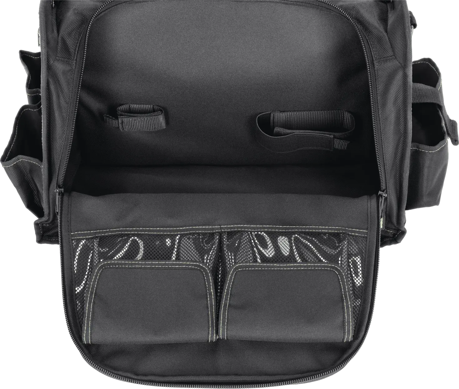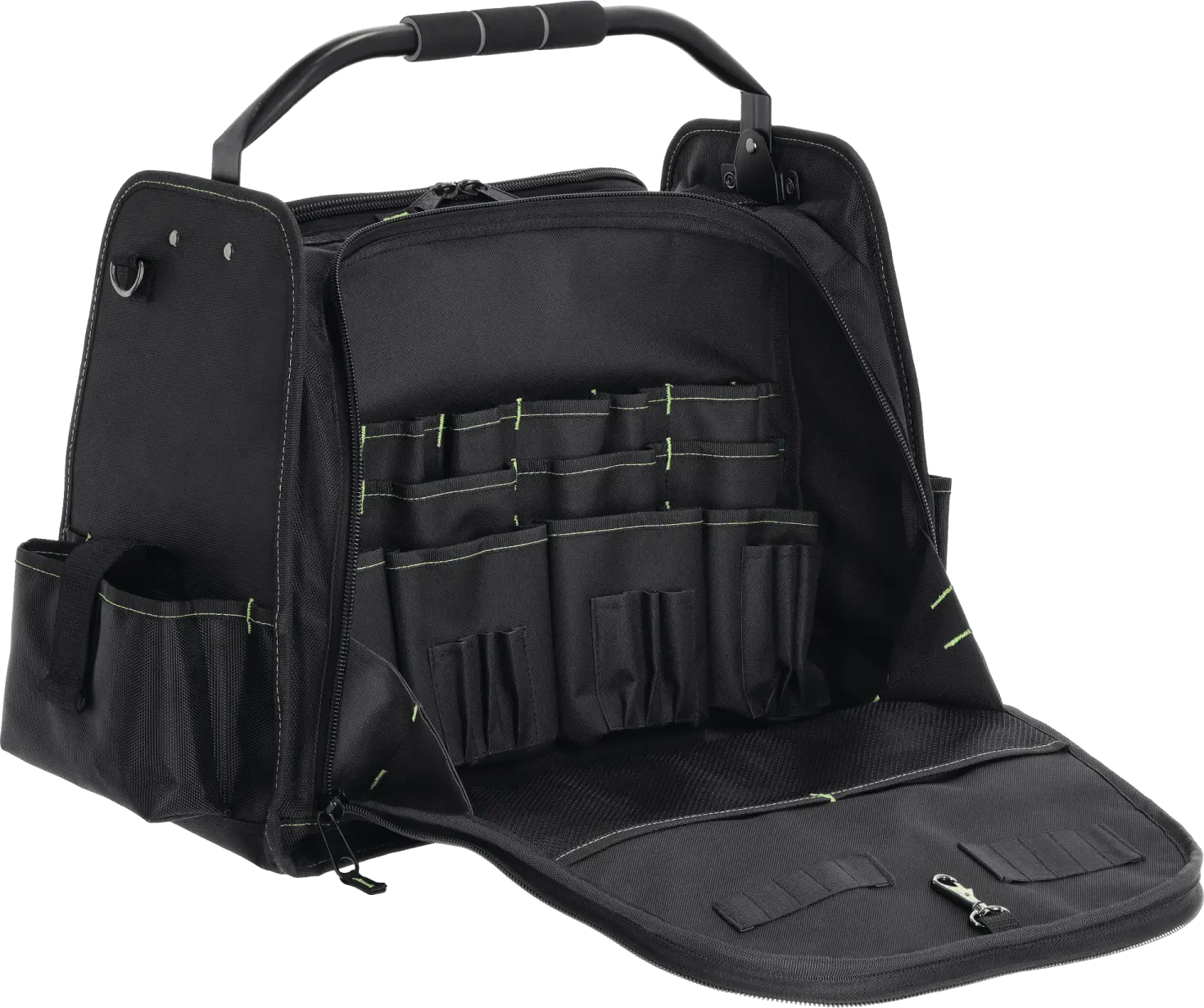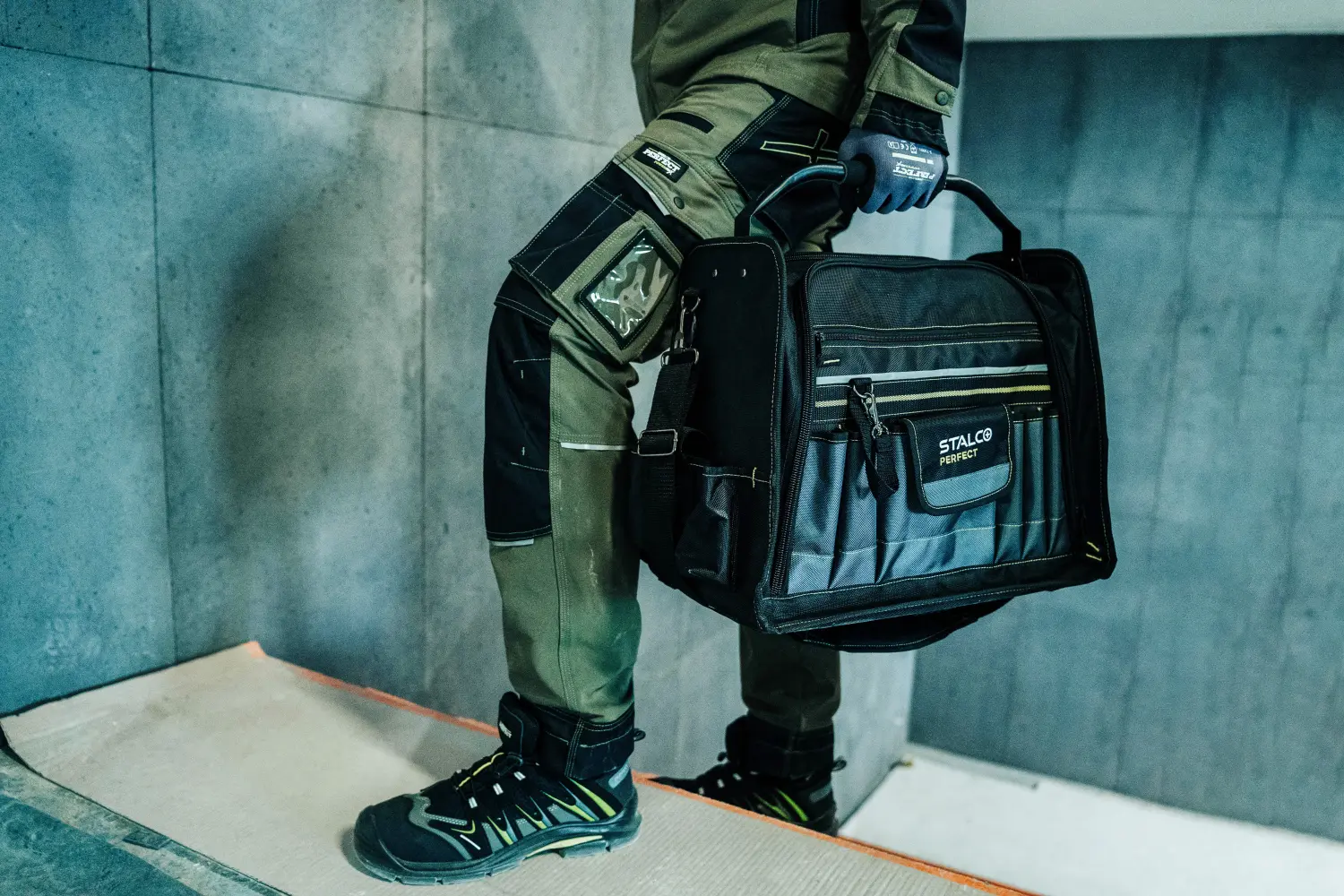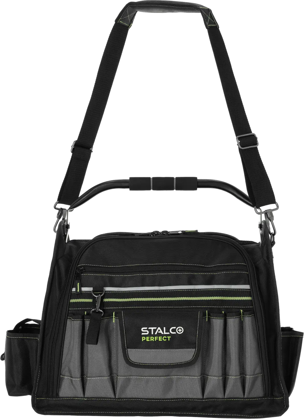 The "TNP20" tool bag from the STALCO Perfect line will prove useful in many industries. This product is designed for transporting tools and accessories helpful in the work of assemblers, mechanics, and service technicians. It is perfect for carrying heavy materials and lightweight tools. The exterior features 12 versatile pockets, an ID pocket, a tool clip and carabiner, and a tape measure hook. The reinforced structure is divided into two spacious compartments. Inside, there are 32 pockets for small items. The compartments are fastened with a strong zipper. A contoured handle with a soft foam lining is used for carrying the bag. The bag can also be worn over the shoulder using a strap. Reinforced polyester material and a robust finish ensure the bag's durability. The bag is resistant to tearing, abrasion, and dirt, making it ideal for harsh construction conditions. 5 rubber anti-slip pads at the bottom and reflective elements improve functionality.