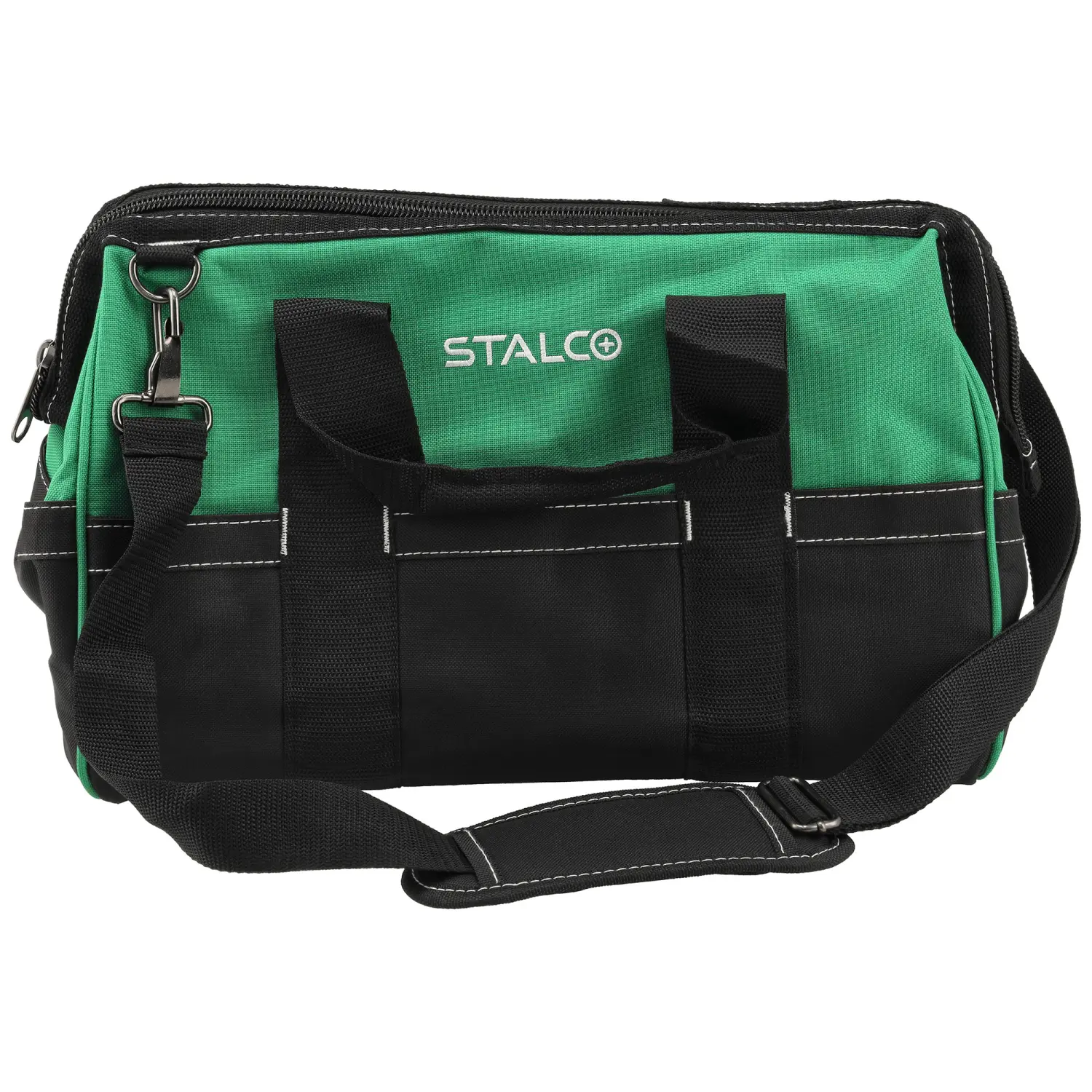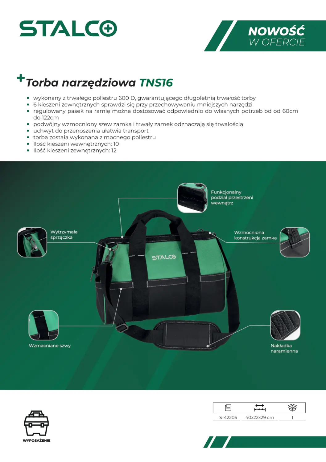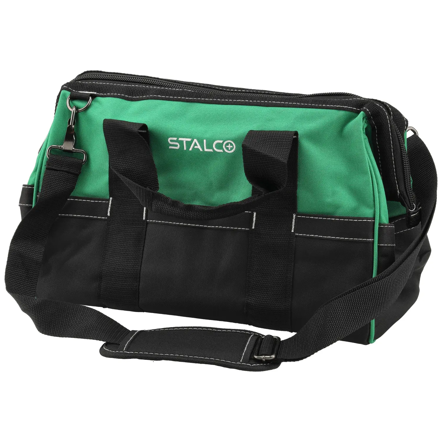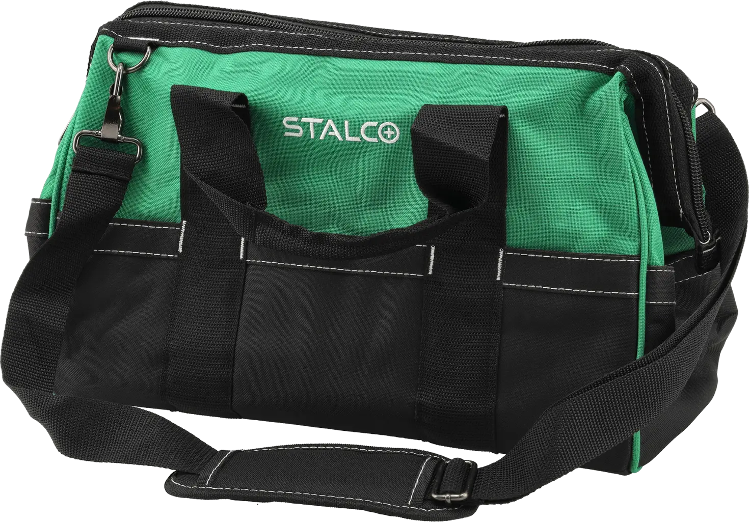 The TNS16 tool bag can be useful for carrying tools and accessories needed at work. It's suitable for both amateur and professional tasks conducted in neutral environments. The bag is made of 600D polyester fabric with excellent durability, ensuring years of use without worrying about wear and tear. The TNS16 STALCO tool bag features a large compartment with 10 internal pockets. The main compartment is fastened with a sturdy zipper with double stitching. The exterior of the bag features 12 pockets of various sizes. These can be used to store accessories, parts, and small tools. The bag is carried with a fabric handle and a shoulder strap that can be adjusted from 60 cm to 122 cm, depending on your needs.