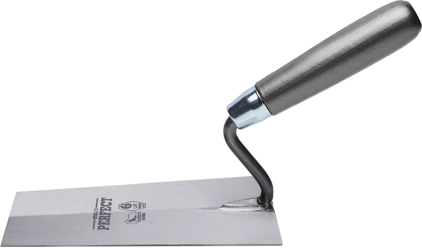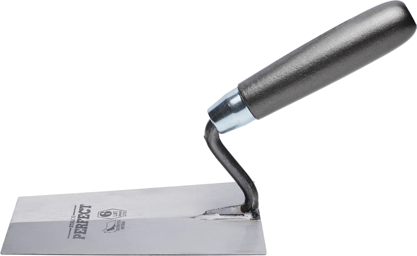 For versatile construction tasks, you'll need a sturdy trapezoidal trowel. This tool is designed for applying plaster, gypsum, and adhesives. It's primarily used for masonry and plastering work, where large quantities of the mixture need to be applied and spread. The STALCO Perfect trapezoidal trowel is made of 1.2 mm thick hardened steel. This material doesn't react with construction materials and ensures the tool's durability. The handle ends with a varnished beech roller. The two parts are joined by a joint, which is covered by a six-year warranty. The tool withstands intensive use in difficult conditions. The simple design and lack of nooks and crannies make it easy to clean the trowel after work is completed. This ensures long service life and efficiency for a wide range of tasks. Large trowels are available in two versions, with a working surface width of 160 and 180 mm.