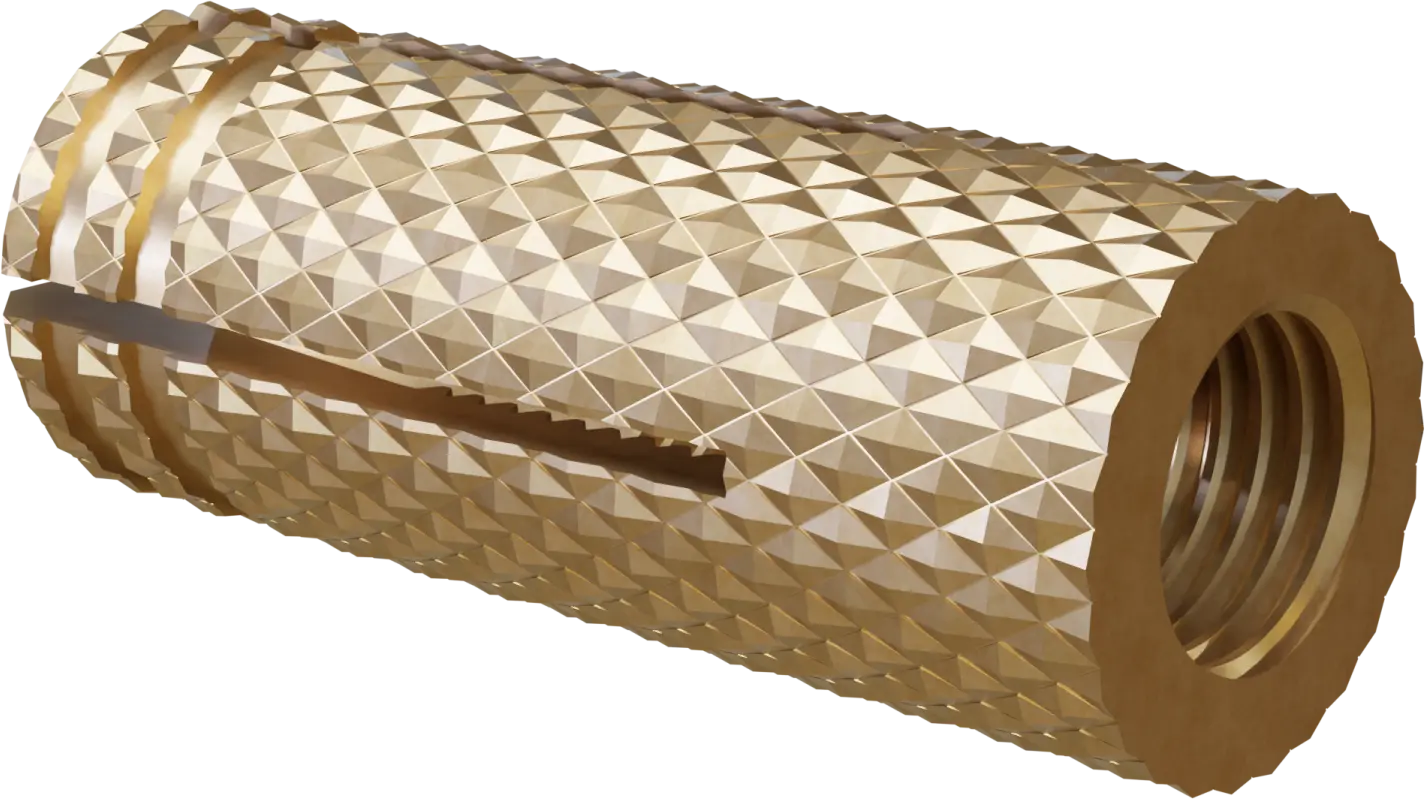 The anchor is made entirely of brass. Its internal thread allows for the attachment of metric rods and screws. Notches at the end allow for the element to expand within the hole.