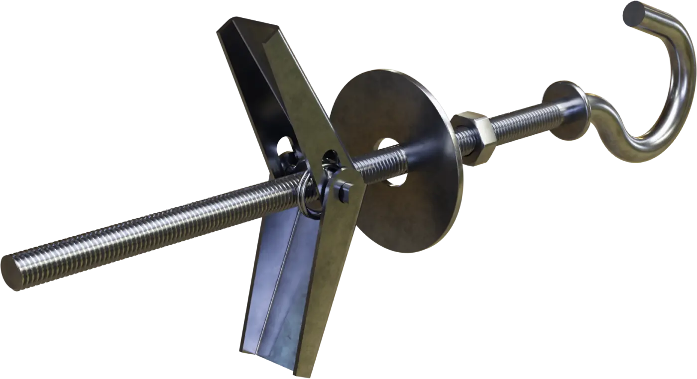 The PARASOLKA expansion anchor for voids is a specialized installation product. It is suitable for construction and finishing work. The element consists of a screw with a round hook, two expansion arms, a washer, and a nut for installation. All components are made of steel and steel sheet with a protective zinc coating.