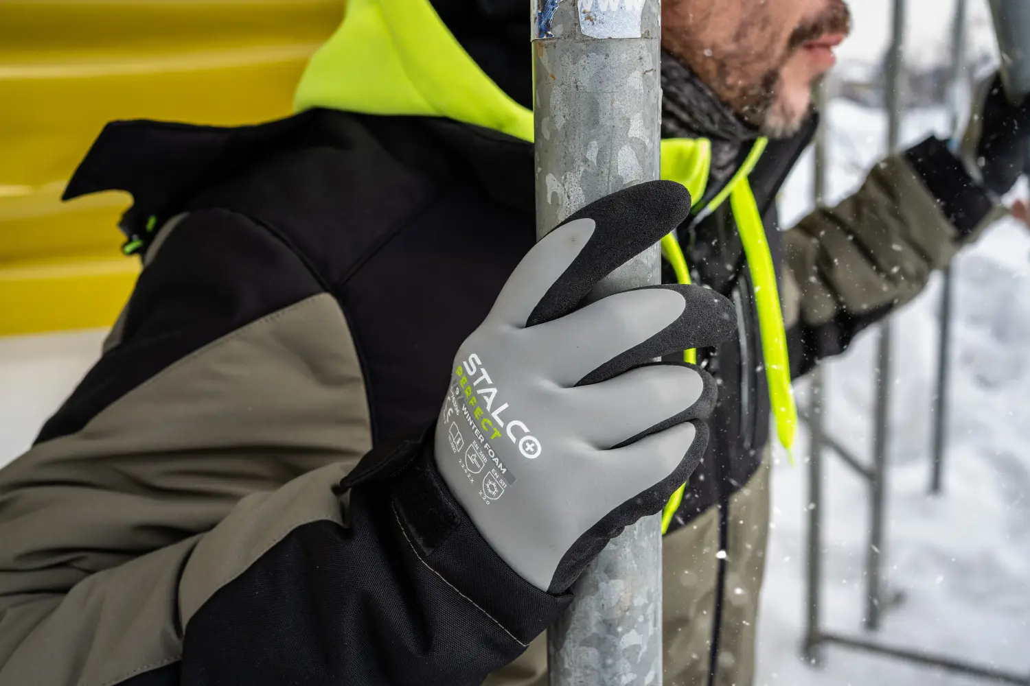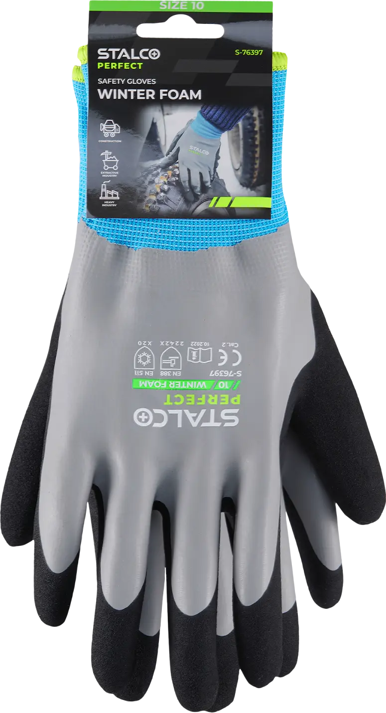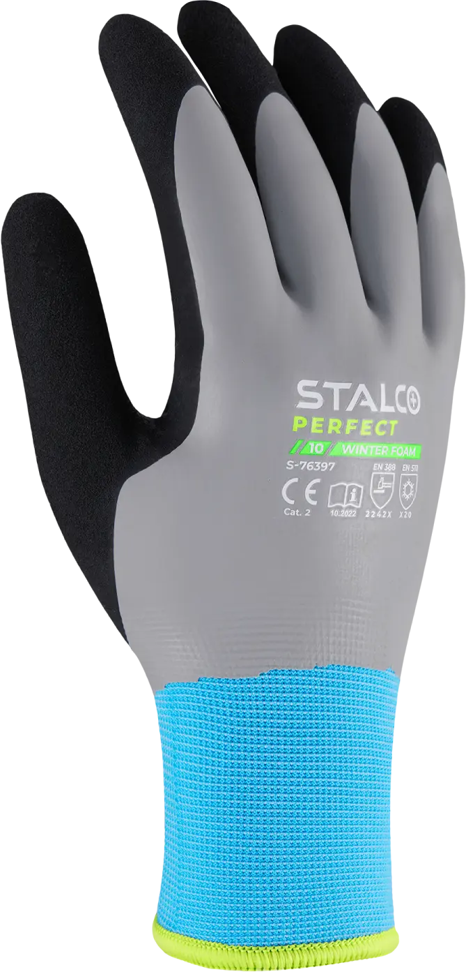 The gloves are made of 15g polyester fabric. They feature a cuff and a comfortable acrylic lining. The Winter Foam STALCO PERFECT polyester gloves feature a double latex coating. A smooth, waterproof layer covers the entire palm. The foam layer is located only on the palm and provides a strong grip. The gloves also feature touchscreen technology, allowing you to operate your smartphone without removing the gloves. The gloves are available in all sizes from 8 to 11.